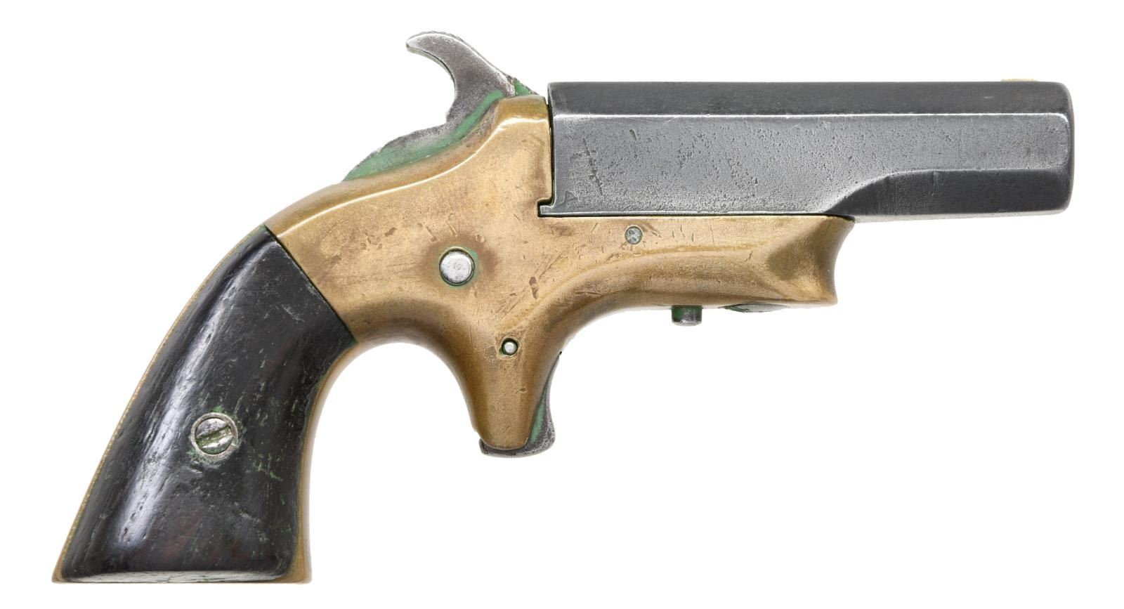 Cal. 41 RF. S# 1043. Bbl 2 1/2". Southerner derringer manufactured by Browning Manufacturing Company. Brass frame with 2 piece smooth wood grips. Barrel has been reblued. Matching numbers are present on the frame, barrel, as well as on the interior of the grips. CONDITION: frame retains pleasant dark patina overall. Barrel exhibits pitting beneath the finish. Dark bore, exhibiting poor rifling throughout. Grips show scattered handling marks and a couple small losses, but otherwise remain sturdy and serviceable. (01-23438/MLW). ANTIQUE. $150-250.