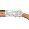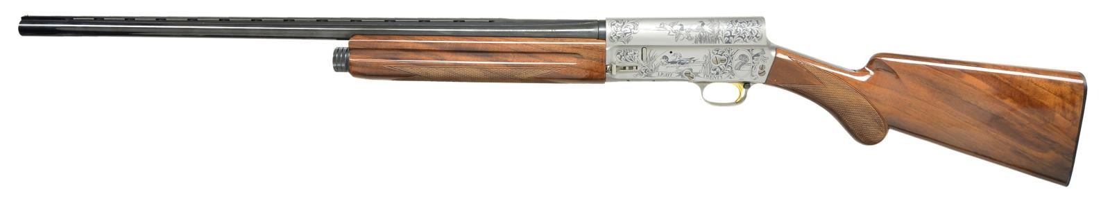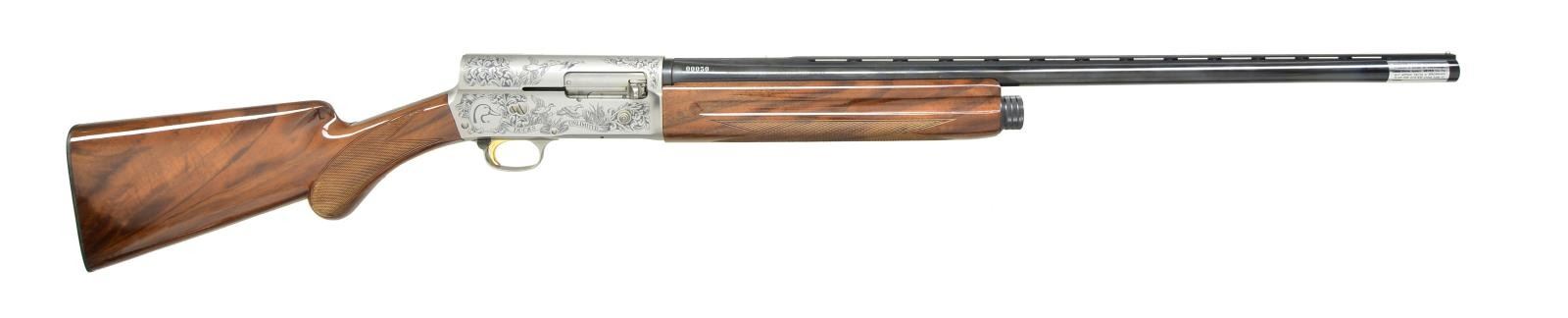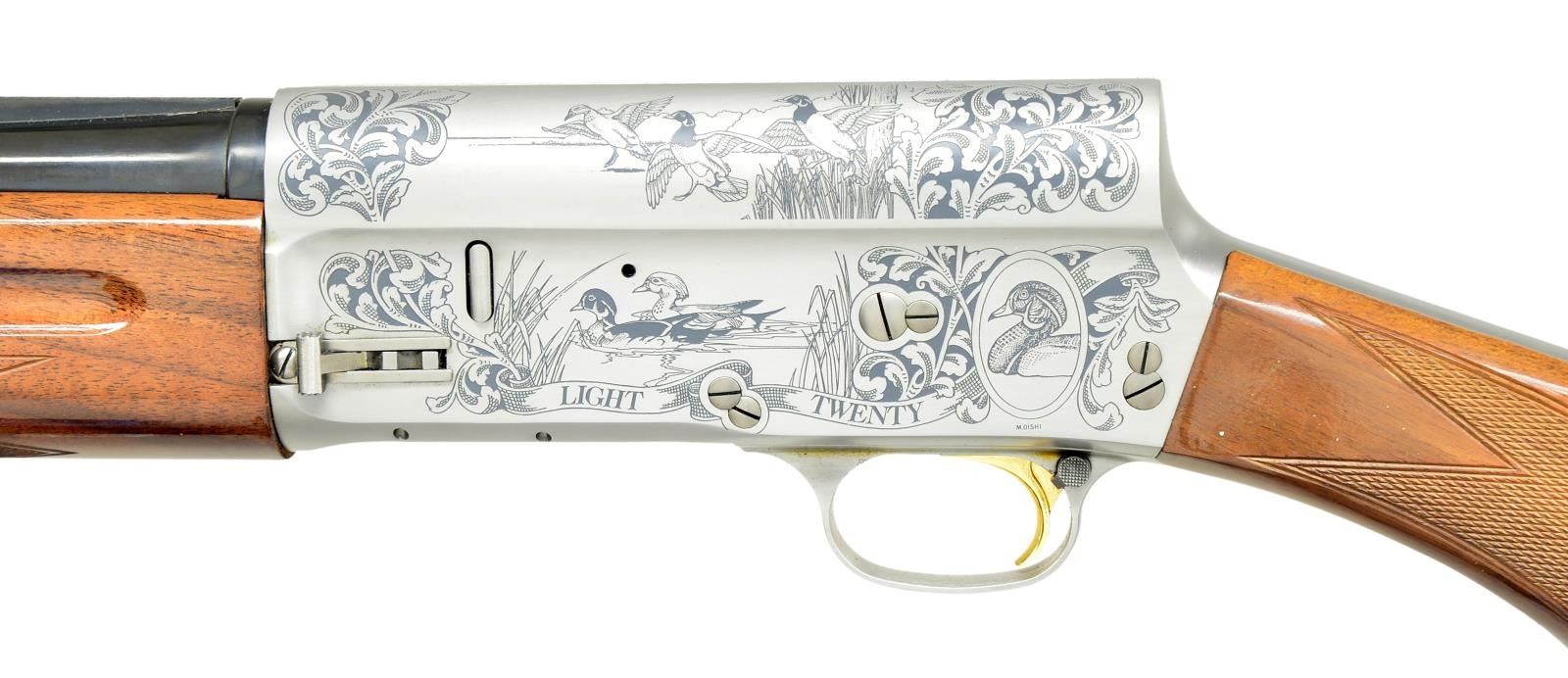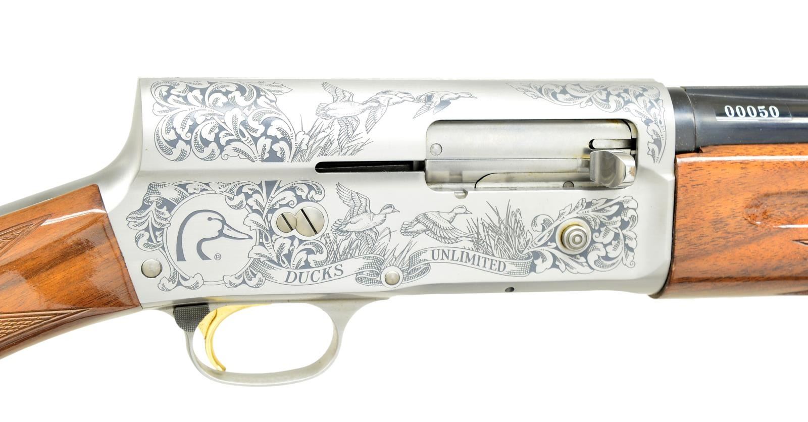 SHOTGUN. Cal. 20 Ga., 2 3/4". S# 90DU000050. Bbl. 26" vent rib w/ invector interchangeable chokes, IC, MOD & FULL choke tubes included. Satin gray finish action w/ special Ducks Unlimited ornamentation on sides & top consisting of North American waterfowl surrounded by foliate scroll. Engraver's signature "M.OISHI" is located at lower left portion of action. Gold finished trigger. Finger groove forearm & rnd. knob stock of fancy walnut w/ gloss finish, cut checkering & original buttplate. 1990 DU auction gun, mfg. limited to 4,500. UNATTACHED ACCESSORIES: DU marked injection molded case with foam lined interior. Case contains spare chokes, instruction manual, Browning knife pamphlet & case keys. CONDITION: over 99% metal finish. Original wood finish shows a few light marks. Bright bore shows plastic fouling toward choke area. (21-4627/DS). MODERN. $1,500-2,500.
