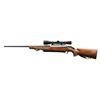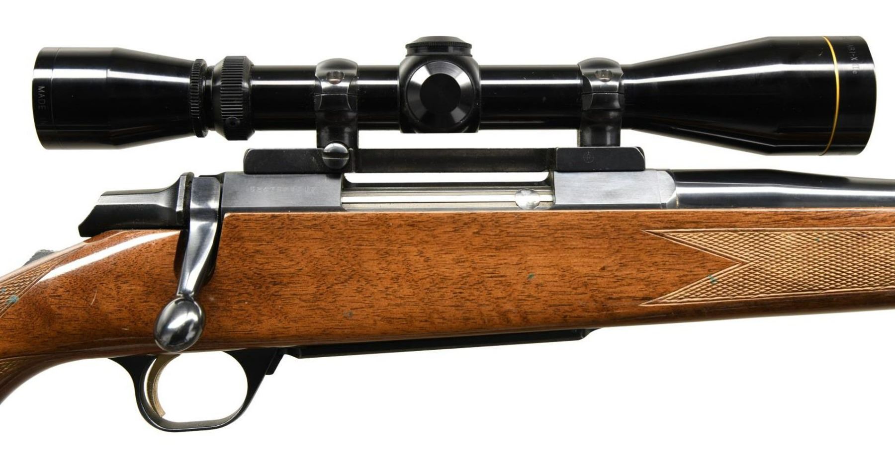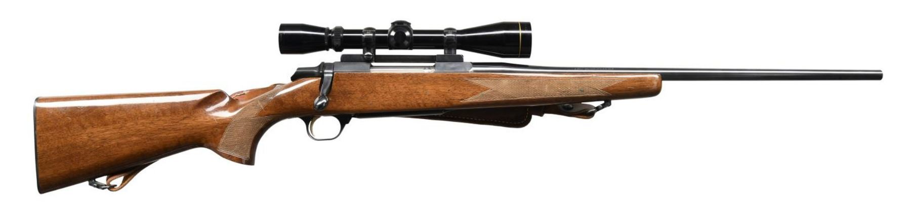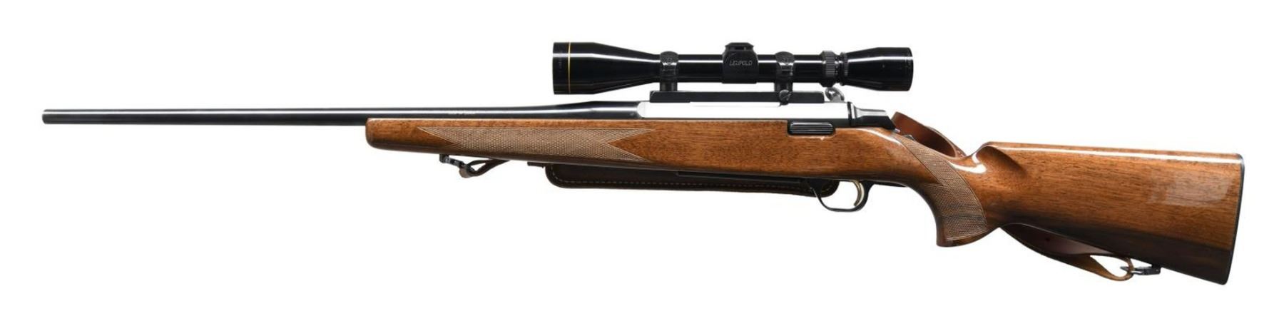 Cal. 270 Win. S# 52479PT717. Bbl 22". A-Bolt bolt action rifle mfg. in Japan and imported by Browning Arms Company of Morgan, UT & Montreal P.Q. Left side of bbl. is marked with Browning's importer information above "MADE IN JAPAN", with the model and cal. designations on the right. Metal components exhibit a blued finish. 1 piece wood stock with checkering at wrist and forend. Rifle is fitted with a Leupold 3x9 VARI-X IIc scope and Hunter brown leather sling. CONDITION: metal components retain bountiful amounts of their original factory blue finish overall. Mirror bore, exhibiting a couple small spots of light pitting and retaining well defined rifling throughout. Stock exhibits scattered marks from handling and storage, but otherwise remains sturdy and serviceable. Scope retains a clear optic. (23-4949/MLW). MODERN. $600-900.