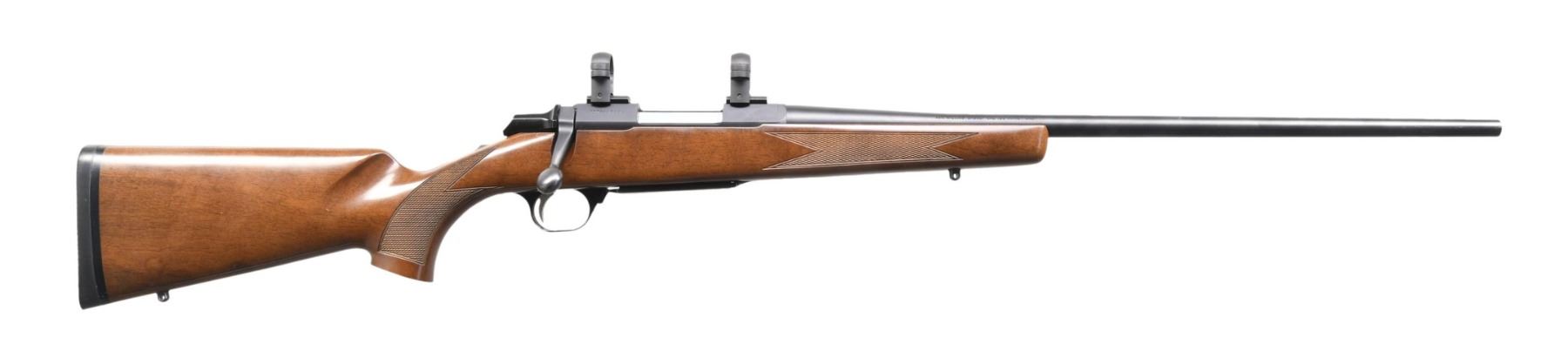 ACTION RIFLE. Cal. 22 Hornet. S# 17765MT351. Bbl. 22". Rifle is devoid of sights but receiver has scope rings present. Mfg. 2006. Dull blue & anodized finishes. Trigger guard has Browning buck logo. Checkered walnut stock with bottom mounted sling studs & factory recoil pad. LOP: 13 5/16". CONDITION: stock shows a few light handling marks. Metal retains 97% original finishes with some light freckling on left side & some light edge wear. Action functions properly when hand cycled. Near excellent bore. (24-5298/MJC). MODERN. $750-1000.