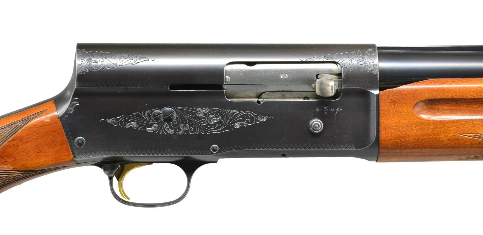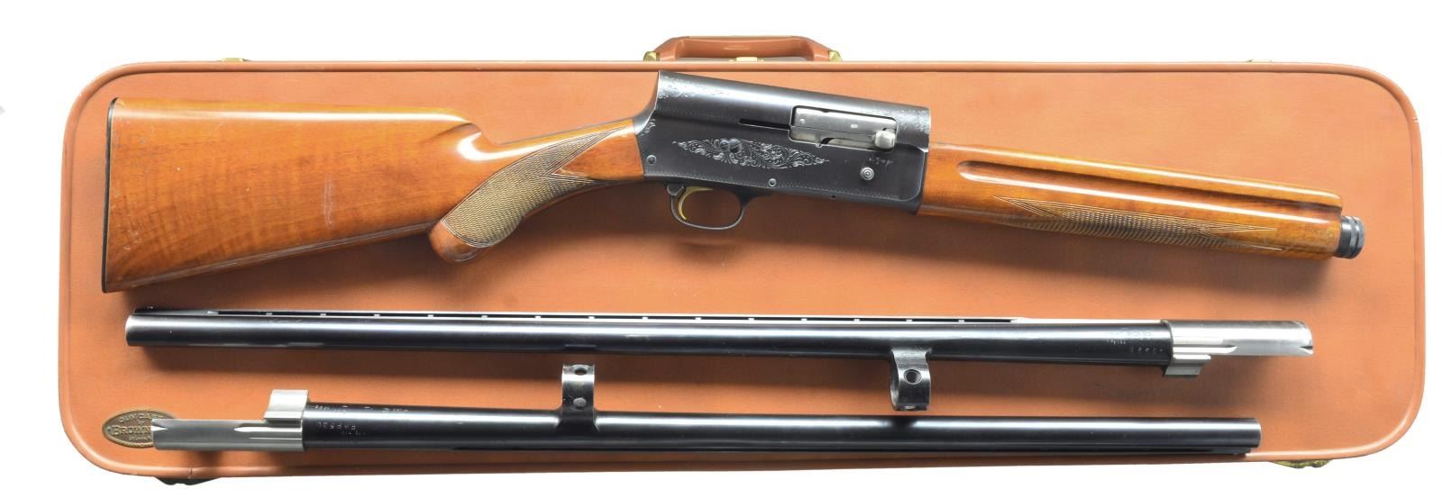 Cal. 12 Ga., 2 3/4". S# 1G65580. (1) Bbl. 26" VR w/ fixed Imp. Cyl. choke. Steel front bead. Numbered "F69530". (2) Bbl. 28" VR w/ fixed Mod. choke numbered "G5591". Blued square stern recoil operated action. Engraving consists of foliate scroll highlights w/ zig zag borders. Gold finished trigger. Finger groove forearm & rnd. knob stock of nicely grained walnut w/ point pattern checkering & original FN marked buttplate. 1961 Belgium Mfg. UNATTACHED ACCESSORIES: Browning Hartmann 2 bbl. set luggage case w/ white handle insert. Case contains spare bbl. & instruction manual. CONDITION: action retains 90% lightly worn blue showing edge wear & sm. scratches. Both bbls. retain over 95% blue & have bright bores. Wood has lightly worn finish showing numerous scratches & marks w/ spots of peeling. Forearm is missing a 1 1/4" chip along right side at action. (20-4348/DS). CURIO. $750-1,150.