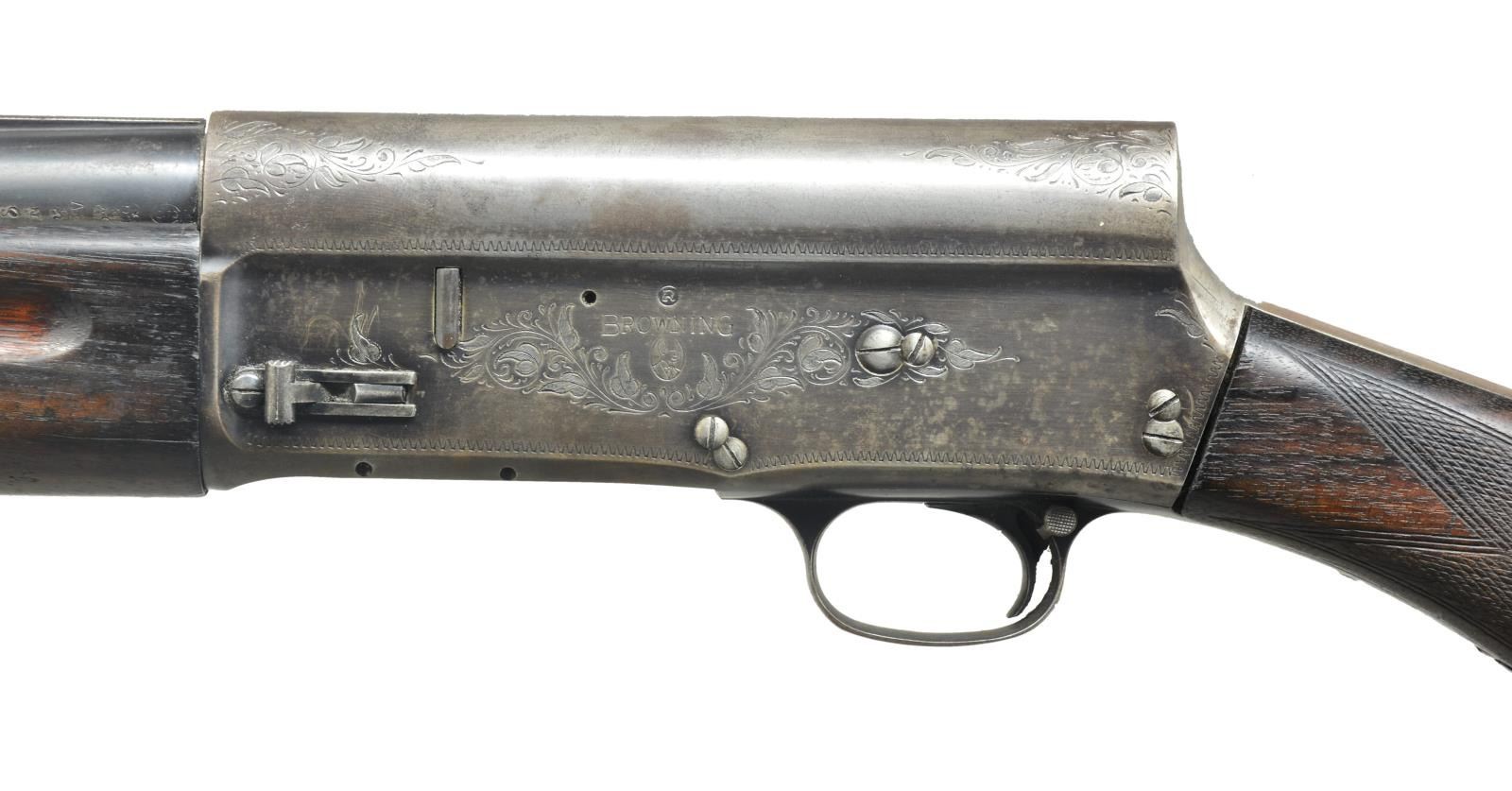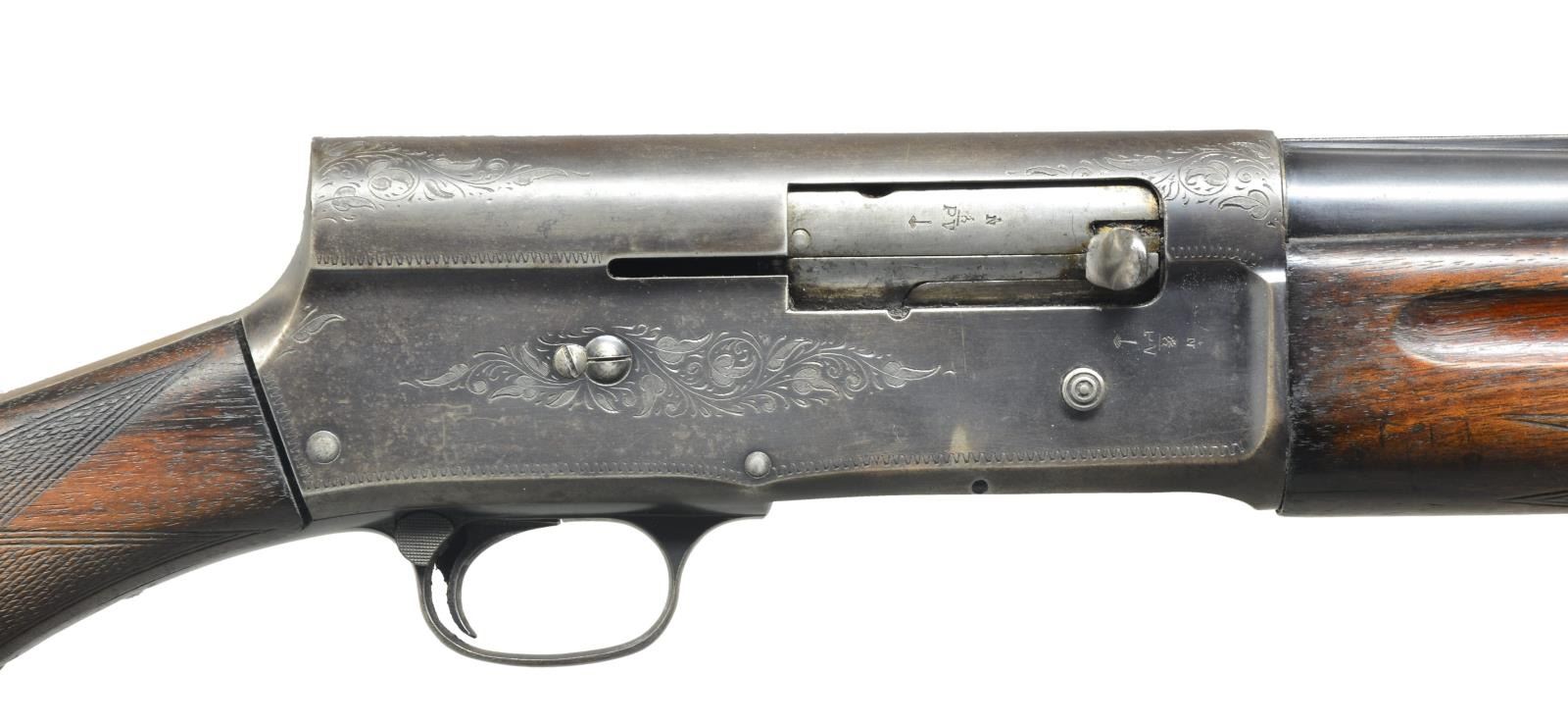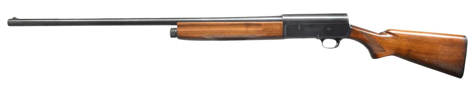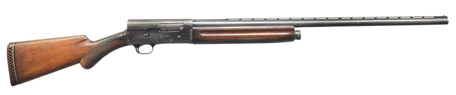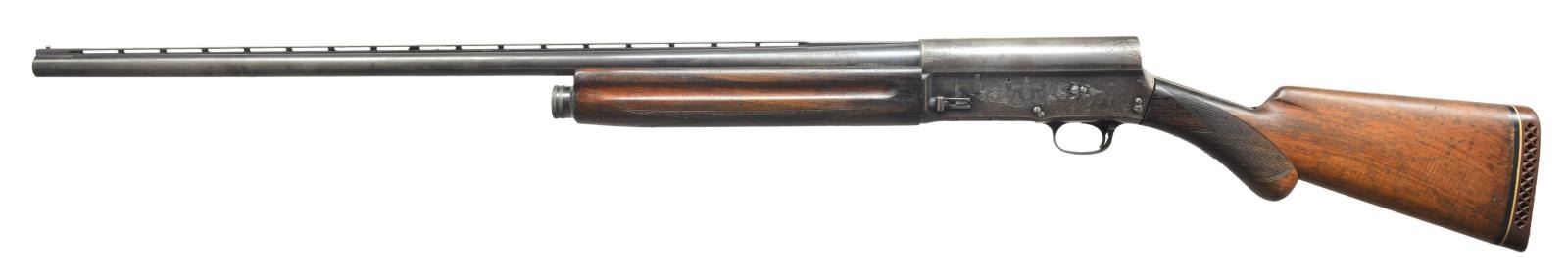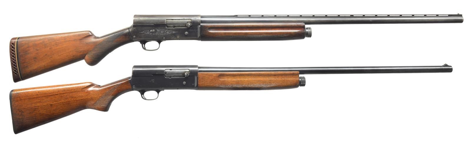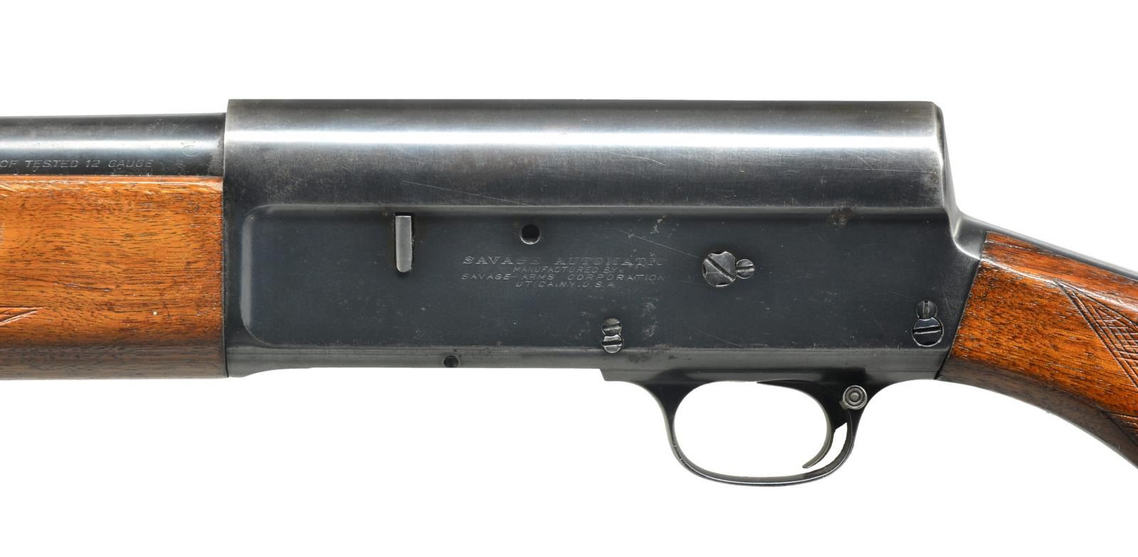 1) BROWNING A5. Cal. 12 Ga. S# 334748. Bbl. 29 1/2” vent rib. Choke modified. Single silver bead front sight. Receiver has standard scroll engraving marked “BROWNING” w/ a bust a John Browning on left side. Standard checkered forend w/ finger grooves & checkered rnd. knob stock w/ dented brown Pachmayr recoil pad. CONDITION: bbl. retains original blue thinning in chamber area & rub marks in front of forend & a couple spots of faint surface oxidation. Receiver has original blue w/ thinning & blending w/ brown silver patina on top & on sharp edges. Forend has traces of original finish. Dark close to receiver w/ 2 minor grain cracks. Good checkering. Buttstock has traces of original finish w/ handling marks darkening around top tang. Buttstock is shy of receiver in tangs. Bore has a few minor pits. (20-3432/BT). 2) SAVAGE. Cal. 12 Ga., 2 3/4". S# 34958. Bbl. 30” plain bbl. w/ bead front sight. Checkered finger groove forend. Center left side of receiver marked “SAVAGE AUTOMATIC MANUFACTURED BY SAVAGE ARMS CORPORATION UTICA, N.Y.U.S.A.”. Checkered pistol grip w/ serrated black hard rubber buttplate. Bbl. retains original blue w/ sm. area of fine surface oxidation. Receiver retains original blue, toning w/ some brown patina & wear on sharp edges. Forend has coat of added finish w/ some handling marks. Good checkering. Buttstock has coat of added finish, a few light scratches & good checkering. Bore is good. (20-3490/BT). BOTH MODERN. $650-900.