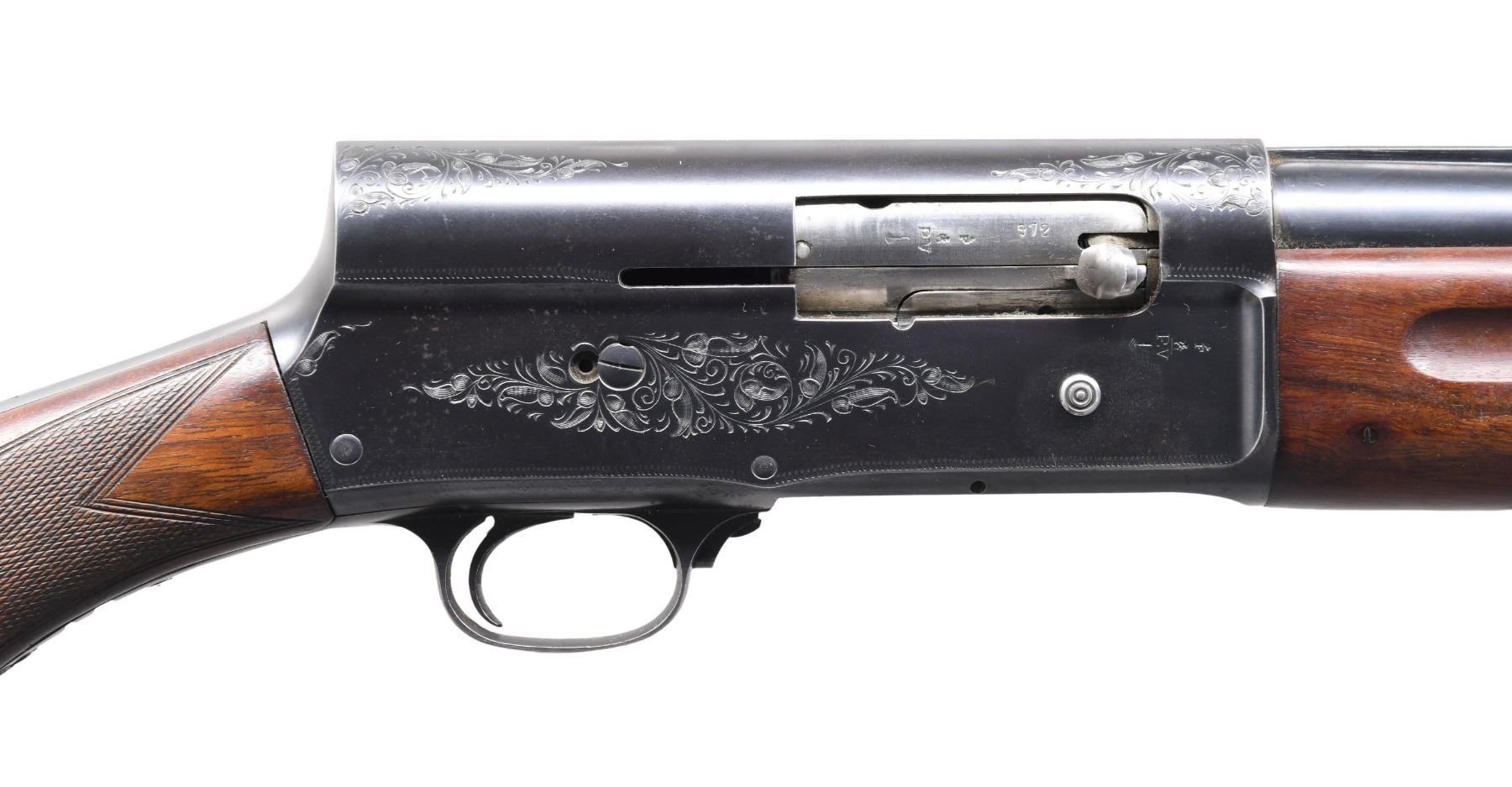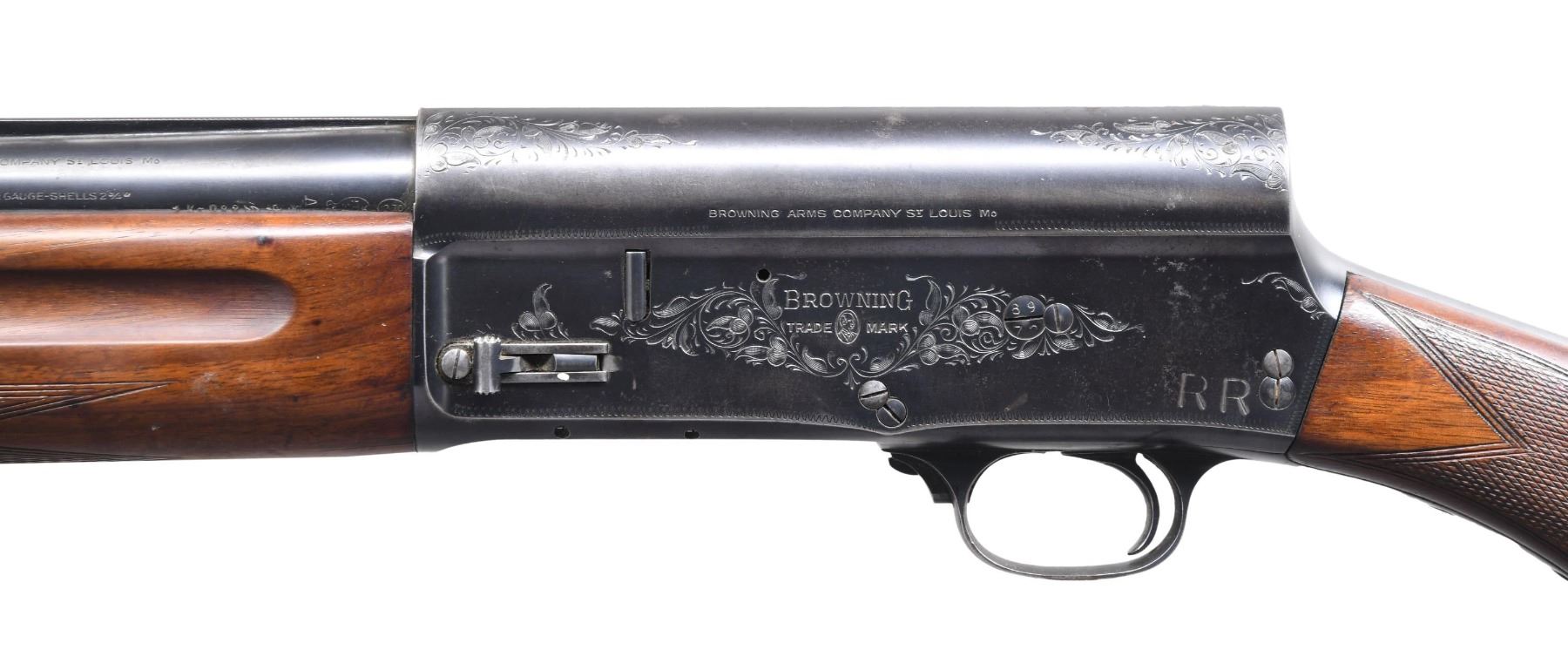 Cal. 12 GA. 2 3/4". S#. 248972. Bbl. 30". Solid raised rib with "Made in Belgium" and "Browning Arms Company St Louis Mo." markings and matching serial number. Full choke. Steel front bead sight. Barrels for A5 shotguns were serial numbered to the gun until 1953, with this specific example dating to late 1947. The last three digits of the serial number are also found on the bolt. The receiver is factory engraved with a foliate scroll and wavy border with Browning trademark, St. Louis Mo Address, and an added hand stamped "RR" on the left side over the trigger guard. Checkered walnut round knob pistol grip stock set with added vent pad. CONDITION: overall good metal finish with the barrel showing some light muzzle wear, a small patch of thinned finish from a rub on the left side 12" from the muzzle, some light scattered handling marks, and mild wear from forearm removal. The receiver is very good, with some light high-edge wear and mild rub marks. There is some fine pinprick oxidation present on metal components. Stock is good with some light handling marks. The forearm has a fine hairline crack that is common to find on these models due to the recoil. Recoil pad is mildly crackling from age. Nice, bright bore. (24-5402/ZAL). CURIO. $350-500.