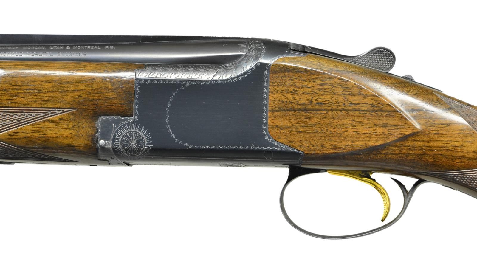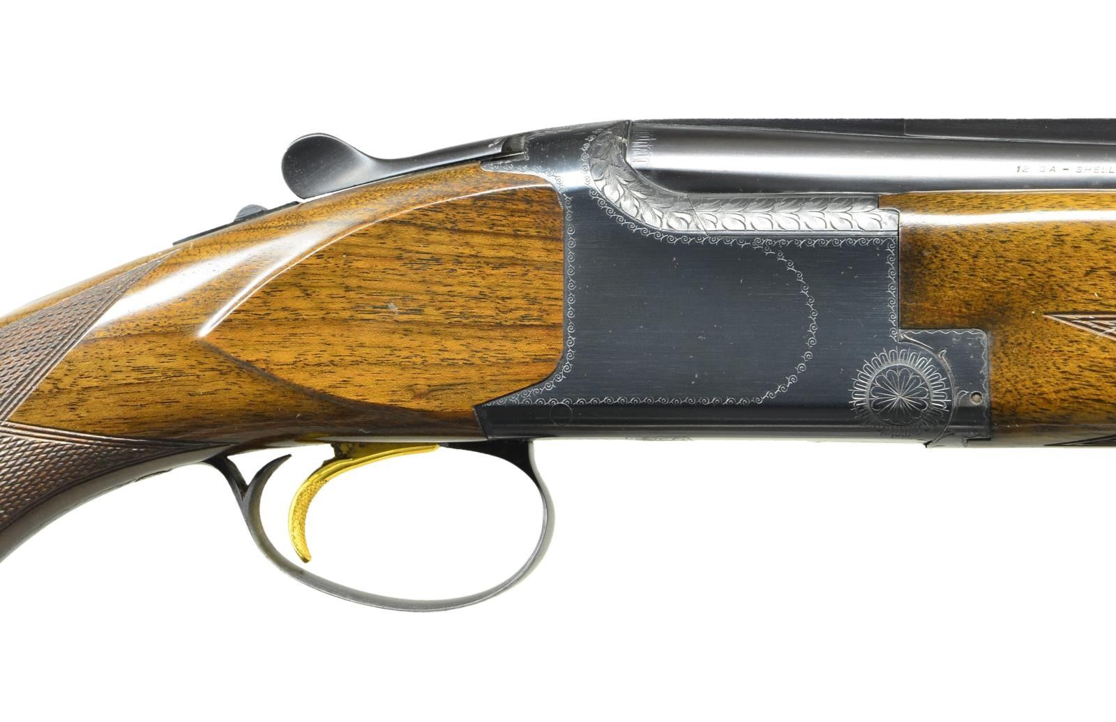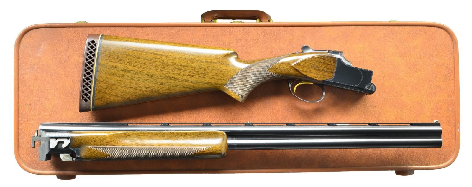 SHOTGUN. Cal. 12 Ga., 2 3/4". S# 40942S74. Bbls. 27 1/2" with fixed skeet & skeet chokes. 12mm VR with white target front sight & white mid bead. Left side of barrels have "BROWNING ARMS COMPANY" over "FABRIQUE NATIONALE HERSTAL BELGIQUE" marking. Blued boxlock action with simple engraving as found on Superlight models. Gold finished SST. Selective ejectors. New style skeet forend & flat knob long tang stock of nicely grained walnut with hand checkering. LOP: altered to 14 7/8" over an aftermarket Pachmayr pad. Weight: 7 lbs, 10.2 oz. 1974 Belgium mfg. for the European market. UNATTACHED ACCESSORIES: Browning 2 barrel set luggage case containing original buttplate & case instructions. CONDITION: over 95% original blue showing scattered spots of freckling. Polished sides of bbl. & takedown lever show patchy surface corrosion. Original wood finish shows a few small marks. Very good bright bores. (22-2103/DS). MODERN. $1,250-1,750.