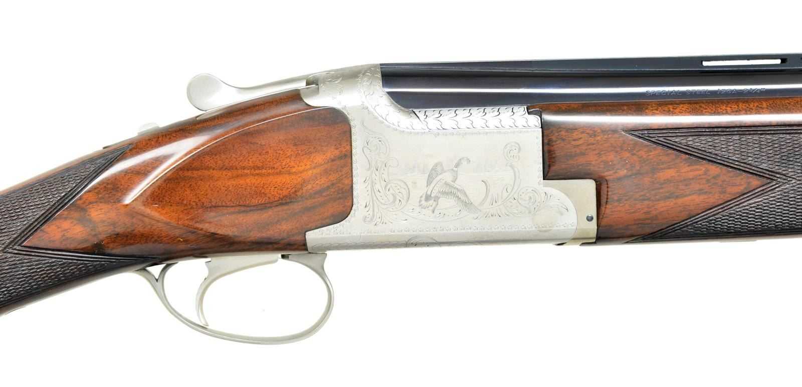ENGRAVING. Cal. 12 Ga., 2 3/4". S# 251PV22035. Standard configuration. 27 5/8" Bbls. with narrow matted ventilated rib have Browning Utah and Montreal addresses. "MADE IN BELGIUM" on left side of top bbl. Bbls. fitted with Invector chokes. Coin finished B25 action with single selective trigger is nicely engraved with scene of flushing pheasant on left and duck on right. Swan neck buttstock of attractively marbled European walnut measures 14 5/8" over red rifle pad. Point pattern checkering is at grip. Captive schnabeled field forend matches well. STOCK: DAH: 2 1/4". DAC: 1 5/8". LOP: 14 5/8". CAST: neutral. WEIGHT: 7 lb. 2 oz. CONDITION: very fine, with evidence of very light use. Bores are bright. Mechanically crisp. (22-4487/MGM). MODERN. $2,500-4,000..