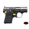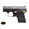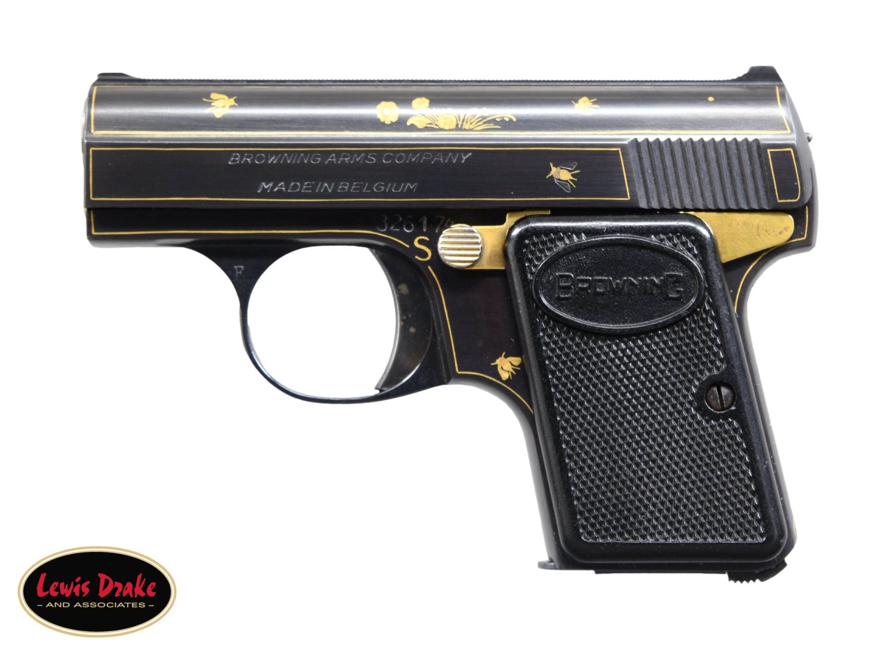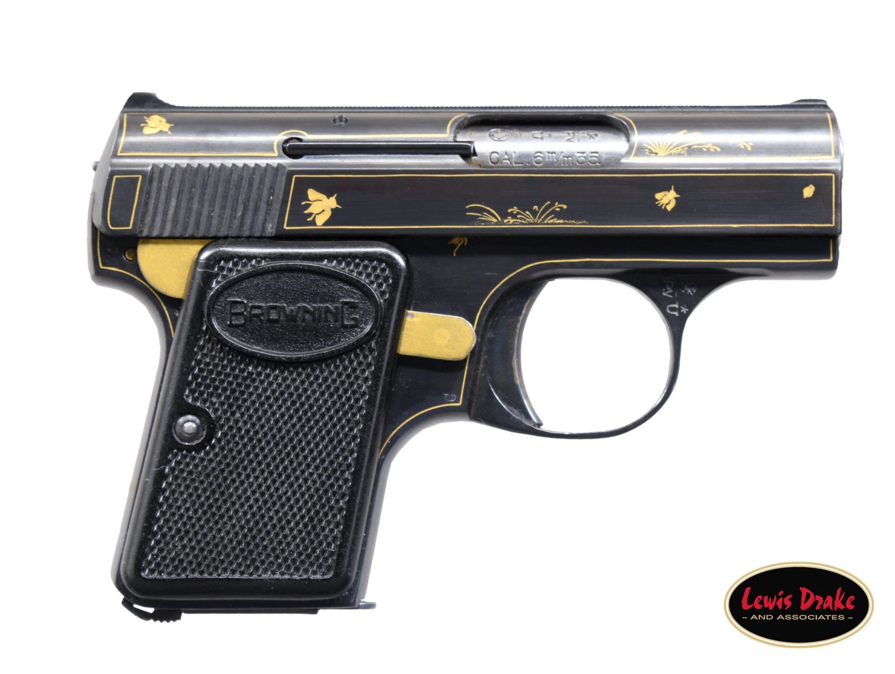 AUTO PISTOL. Cal. 6.35mm (25 ACP). S# 326174. Custom gold inlays by Thierry Duguet, traditional hand engraver from Charlottesville, VA. Slide & frame have gold wire inlaid borders w/ floral & insect highlights. Gold finished safety lever. Bbl. 2". Blue finish w/ case colored trigger. 2 piece checkered plastic grips. MAGS: 1 detachable 6 rd. CONDITION: near excellent custom finish. Bright near excellent bore. PROVENANCE: from the renowned collection of quality sporting arms from Lewis Drake together with inventory of Lewis Drake Associates. (24-6591/DS). MODERN. $1,200-2,000.
