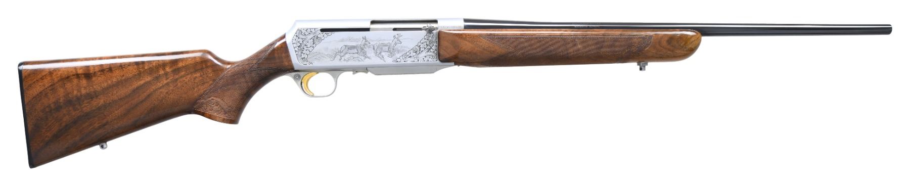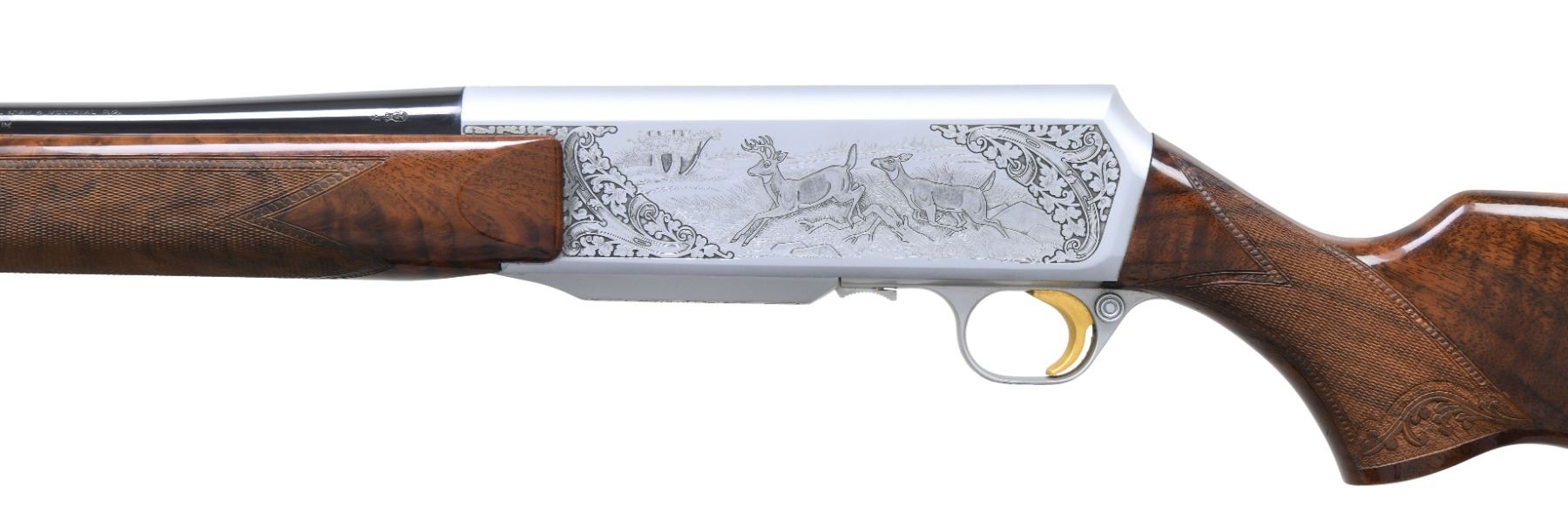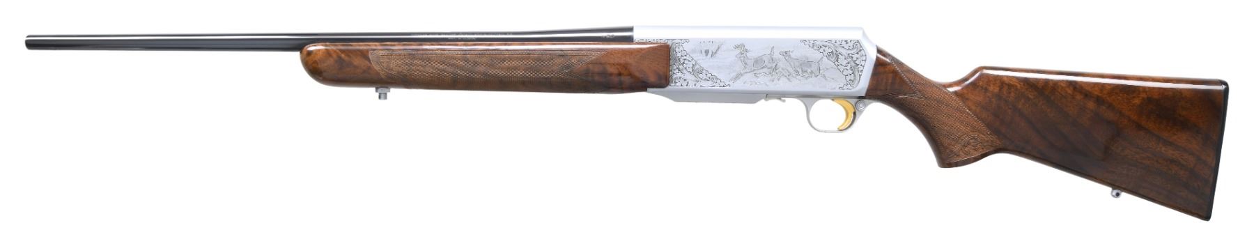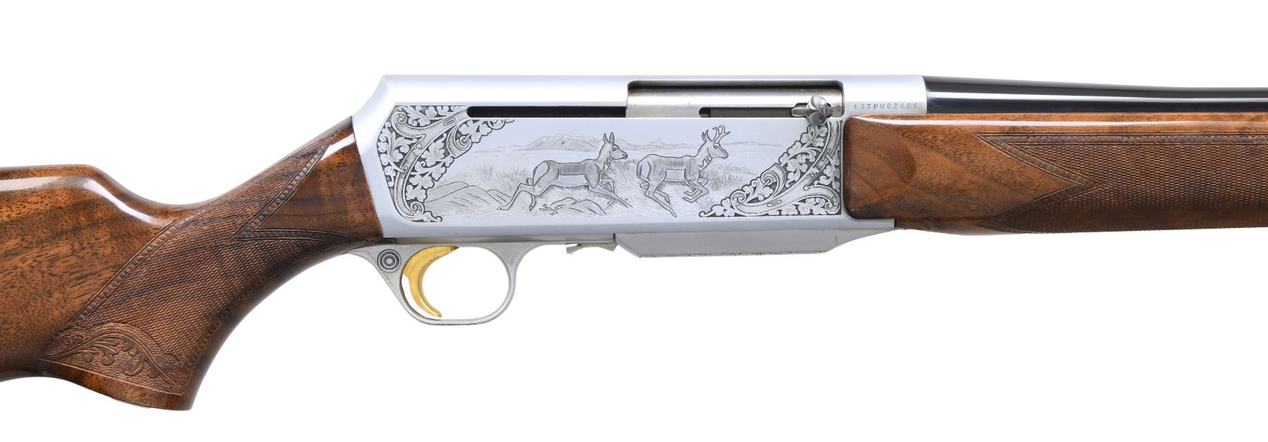 Cal. 270 Win. S# 437PM02665. Bbl is 22" rnd w/o sight. Satin gray finished action features two running antelope on right side w/ running whitetail buck and doe on left. Game scenes are highlighted by wedges of foliate scroll. Engraving continues to trigger guard and mag cover. Forearm and pistol grip stock of gloss finish. Fancy European walnut with hand checkering having beaded and carved decorative borders. Features include gold plated trigger, plastic buttplate and sling eyes. Belgium manufacture. Mag: 1 4-rd detachable. CONDITION: 97% metal finish. Original stock finish shows a few small scratches and handling marks. Bright near excellent bore. (25-1185/DS). MODERN. $3,000-4,000.