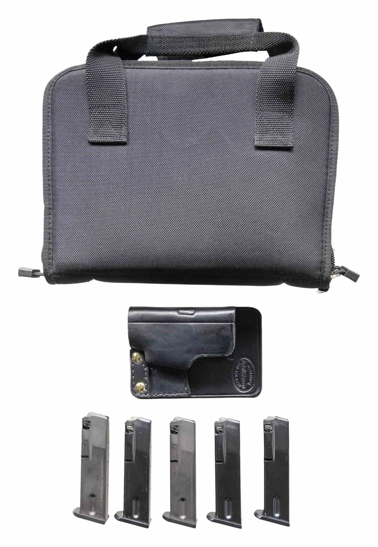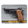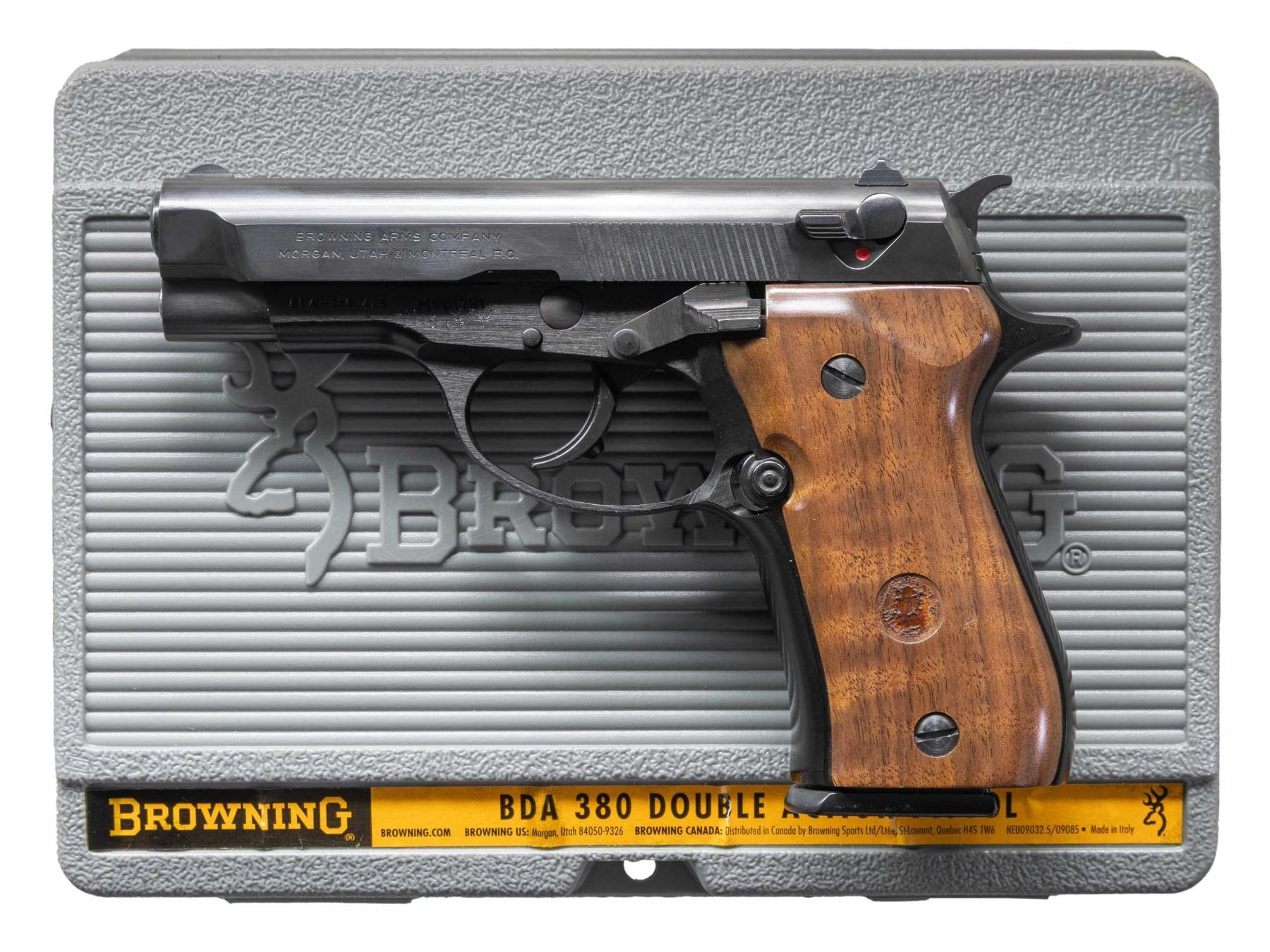 Cal. 380 ACP. S# MY01791. Bbl. 3 3/4". Blade front sight. Square notch rear sight. Browning BDA made in Italy by Beretta for FN. Anodized frame. Blued slide. Walnut grips with gold Browning medallion on right panel & missing medallion on left. MAGS: 5-13 rd. UNATTACHED ACCESSORIES: matching numbered factory hardcase, UTG black softcase, black leather pocket holster, trigger lock & manual. CONDITION: metal & grips show light handling & usage marks. Action functions properly when hand cycled. Very good plus bright bore. (25-6225/MJC). MODERN. $400-600.