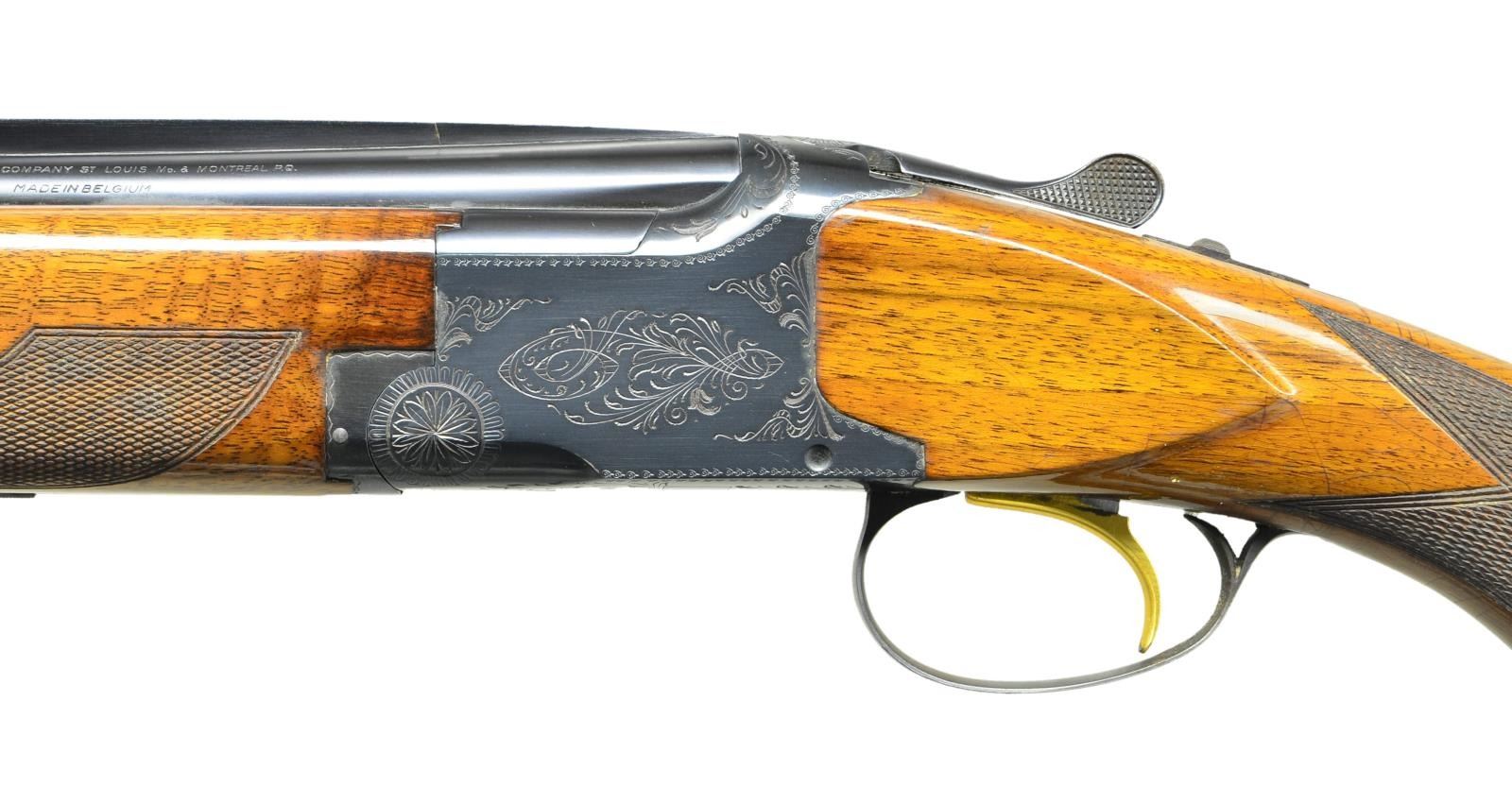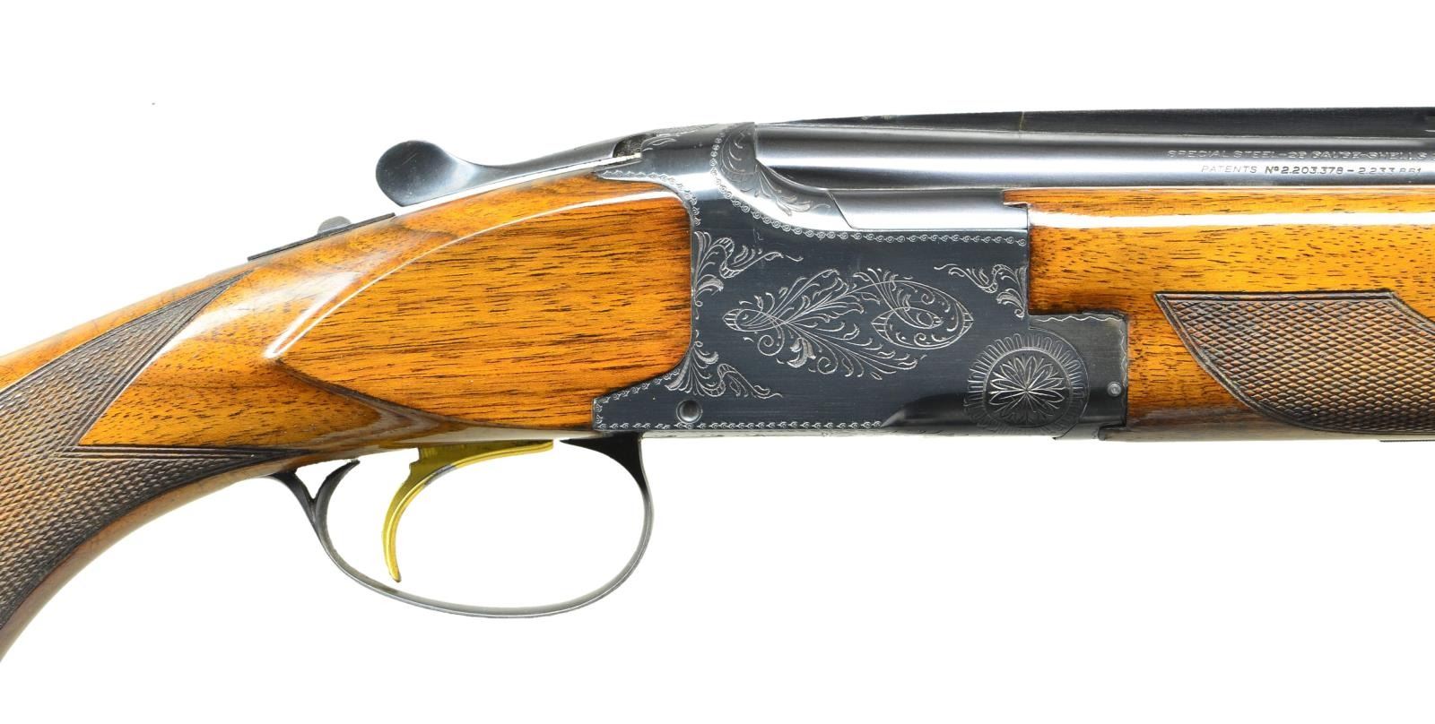 O/U SHOTGUN. Cal. 28 gauge 2-3/4" S# 2266F8. Bbl. 26-1/2" vent rib with fixed Skeet & Skeet chokes. White target front sight with white mid bead. Blued boxlock action has grade 1 scroll engraving. Gold plated SST. Selective ejectors. New style skeet forend with flat knob short tang stock. LOP. altered to 14-1/4" over aftermarket Browning ventilated pad. Belgium 1968 mfg. CONDITION: Over 97% original blue showing some slat wood corrosion around stocks. Stocks have lightly crazed finish showing some finish loss around metal and spots of mildew. Very good bright bores. (22-3644/DS). CURIO. $2500-3500.