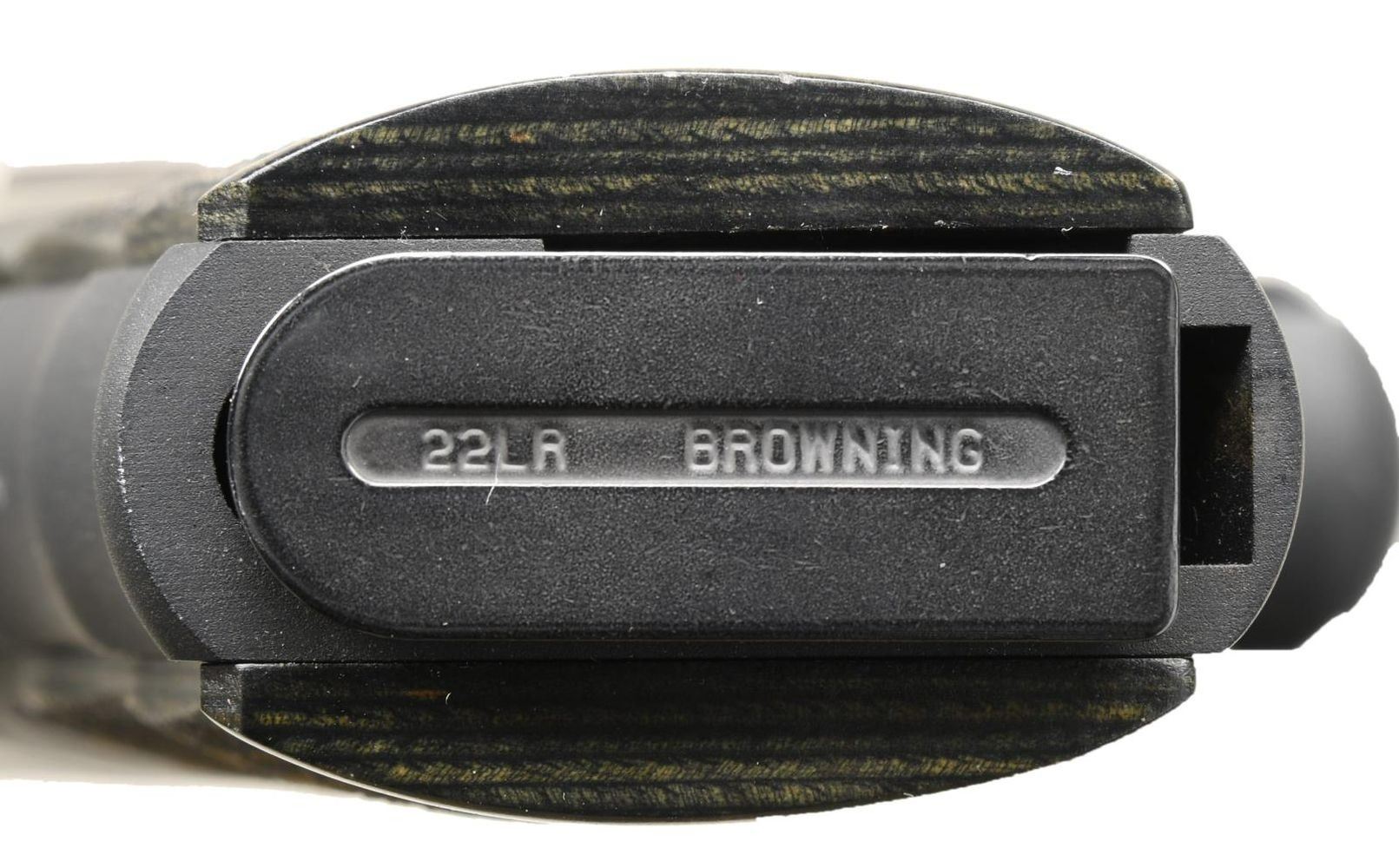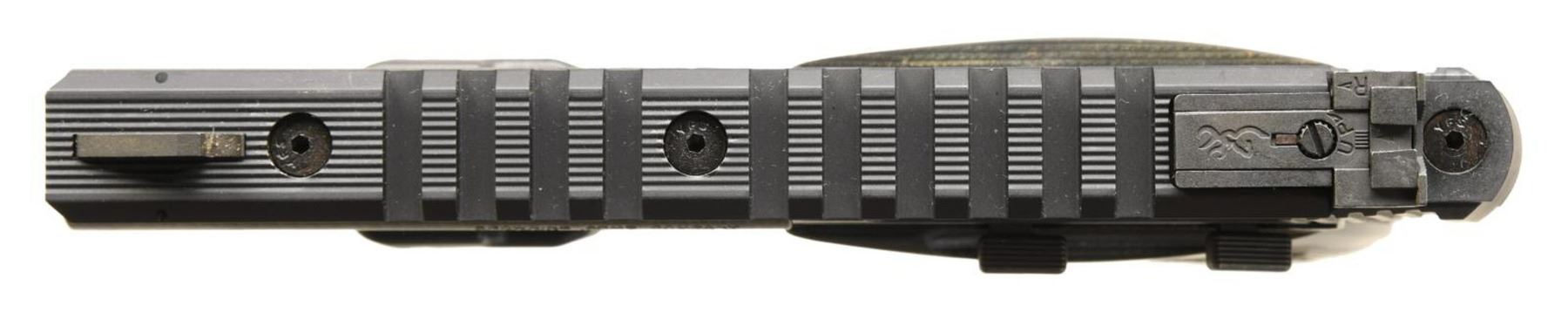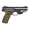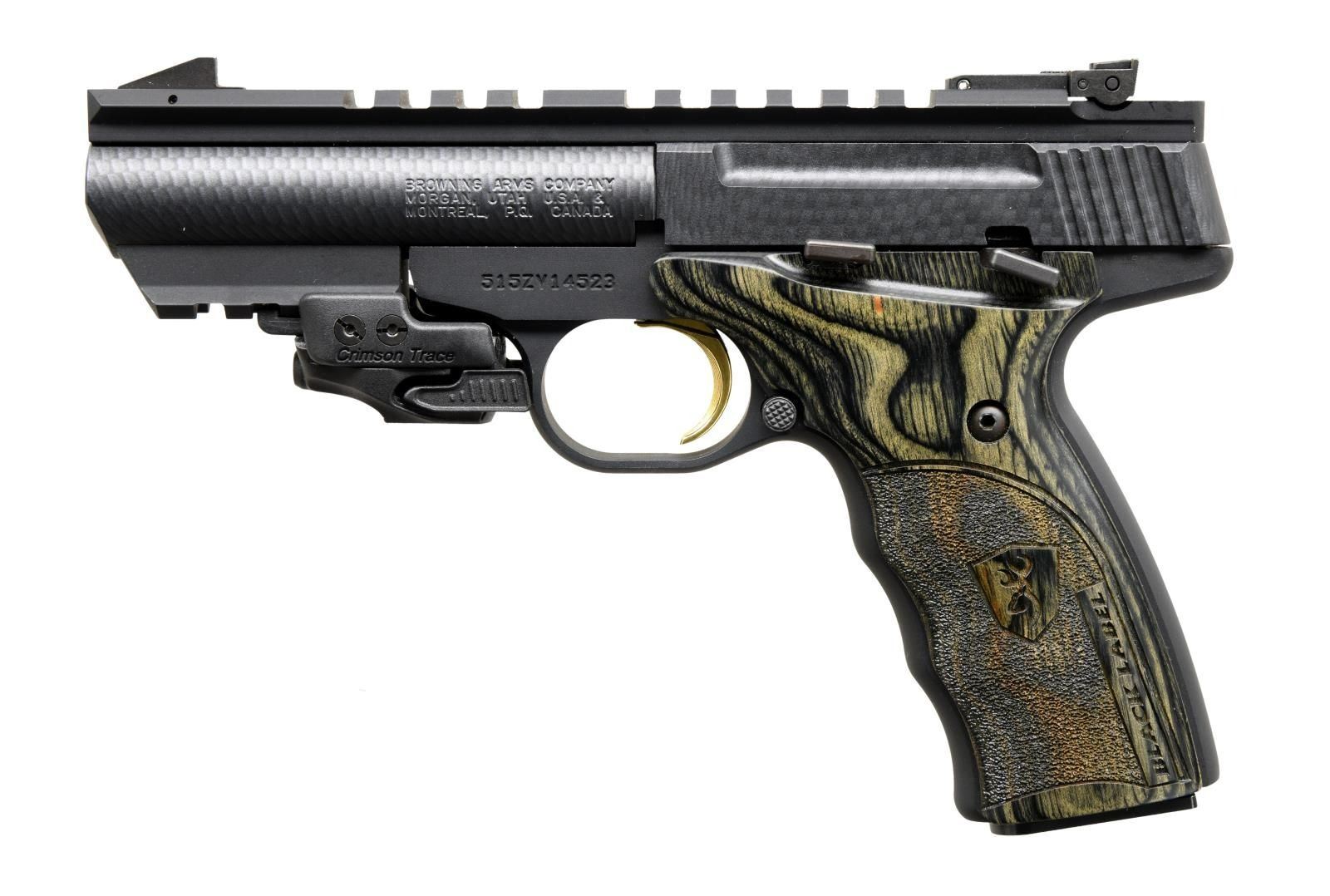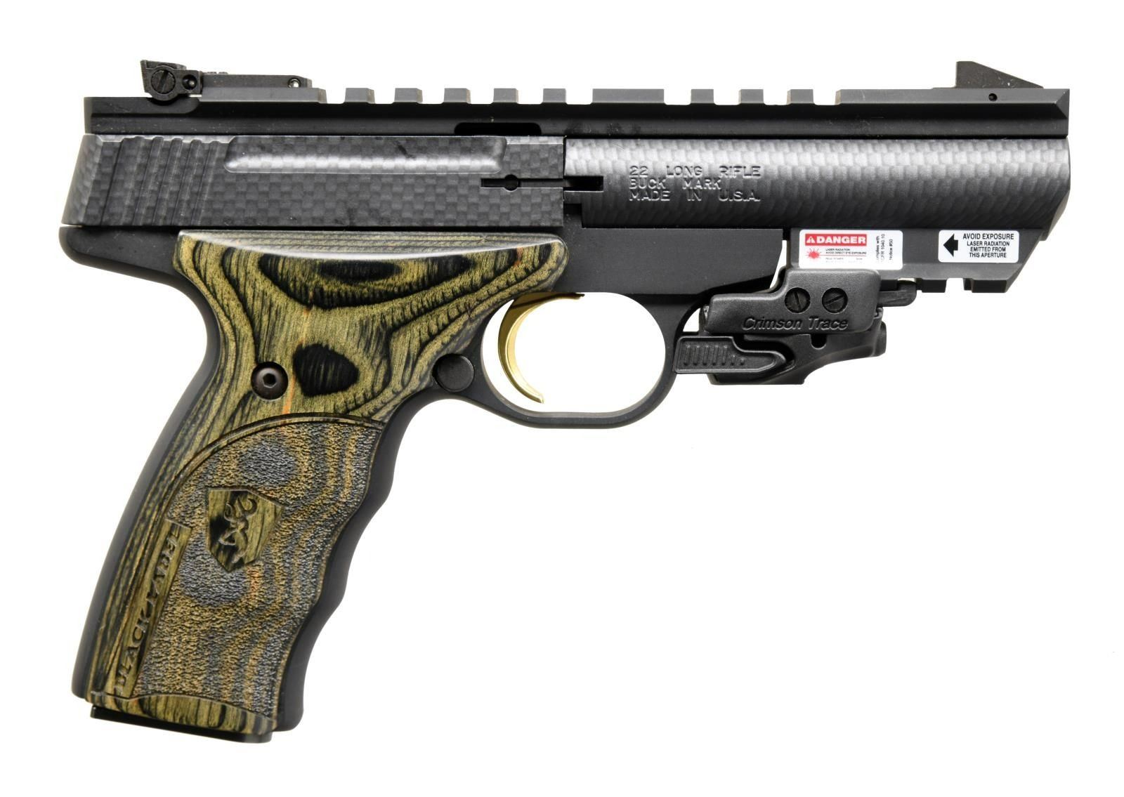Cal. 22 LR. S# 515ZV14523. Bbl. 4". Ramped blade front sight. Adjustable rear sight. Top mounted full length picatinny style rail. Carbon fiber & matte black finished. Gold trigger. Crimson Trace laser mounted on front picatinny style rail. Black Label laminated grips. MAGS: 1-10 rd. factory. UNATTACHED ACCESSORIES: w/box. CONDITION: metal shows a couple light scratches & some handling wear. Other aspects rate very good plus or better. PROVENANCE: The Collection of Gun Sport Ltd owned by Jon R. Thomas. (23-4128/MJC). MODERN. $500-650.