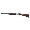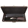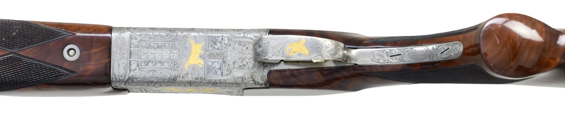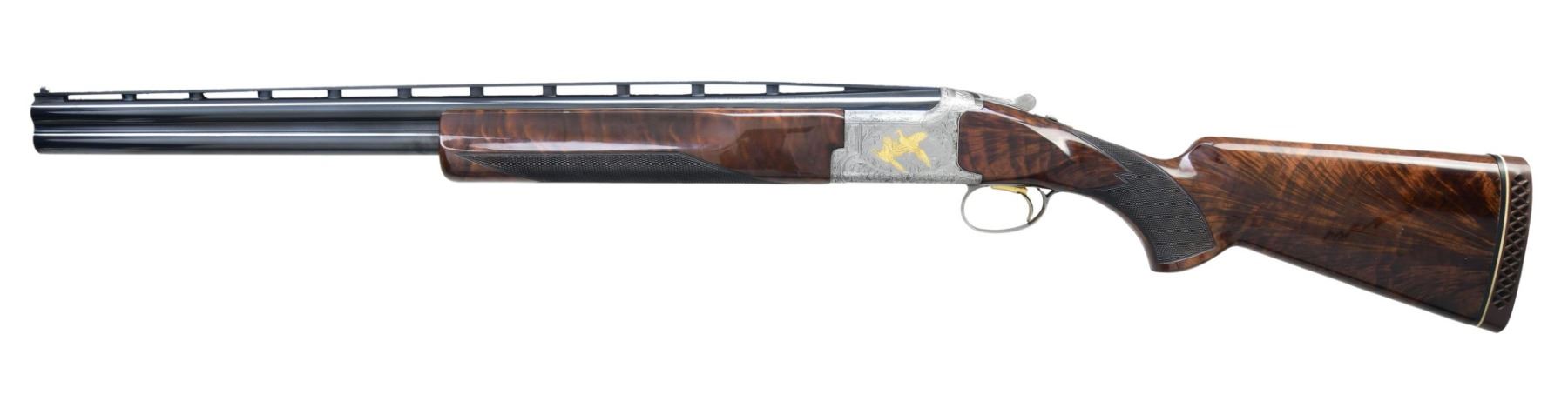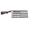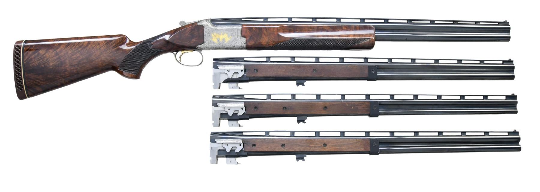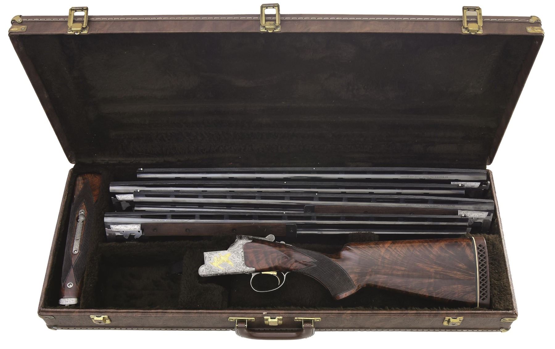 CASE. Cal. 12 Ga., 20 Ga., 28 Ga., .410 Ga. S# 16877PT6A3. All barrels have fixed Skeet & Skeet chokes and are fitted with raised ventilated ribs and have correct Browning markings on top barrels. Coin finished Citori action with gold plated single selective trigger is hand engraved in grade VI style with large shaded acanthus scroll surrounding gold inlaid game scenes. A pair of pheasant rise over corn stubble on left and a trio of ducks erupt from a marsh on right. A setter graces bottom of action and a quail flies across trigger guard bow. Superb crotch figured American walnut pistol grip buttstock measures 14-3/8" over Browning pad. Point pattern checkering is at grip. One piece ejector flared target forend has Deeley type release and serves all barrel sets. MEASUREMENTS: 12 Ga. STOCK: DAH: 1-15/16". DAC: 1-1/2". CAST: neutral. LOP: 14-3/8". WEIGHT: 7 lb. 3 oz. UNATTACHED ACCESSORIES: gun is housed in brown Browning vinyl case lined in brown faux fur which holds gun and all barrel sets. CONDITION: fine showing moderate use. Retaining nearly all factory finishes on wood and metal with some high edge wear and a fair scattering of light marks in wood. All bores are bright and shiny. Mechanically good. Case is good. (24-4015/MGM). MODERN. $3,000-5,000.