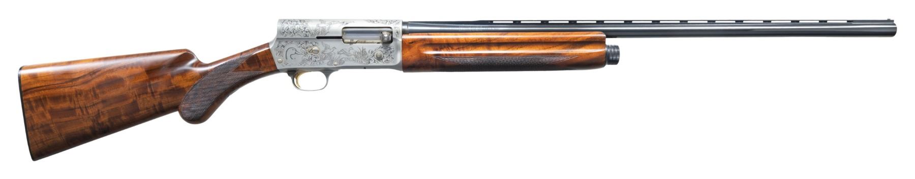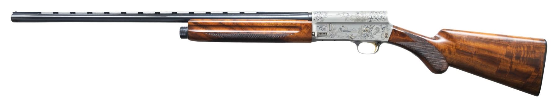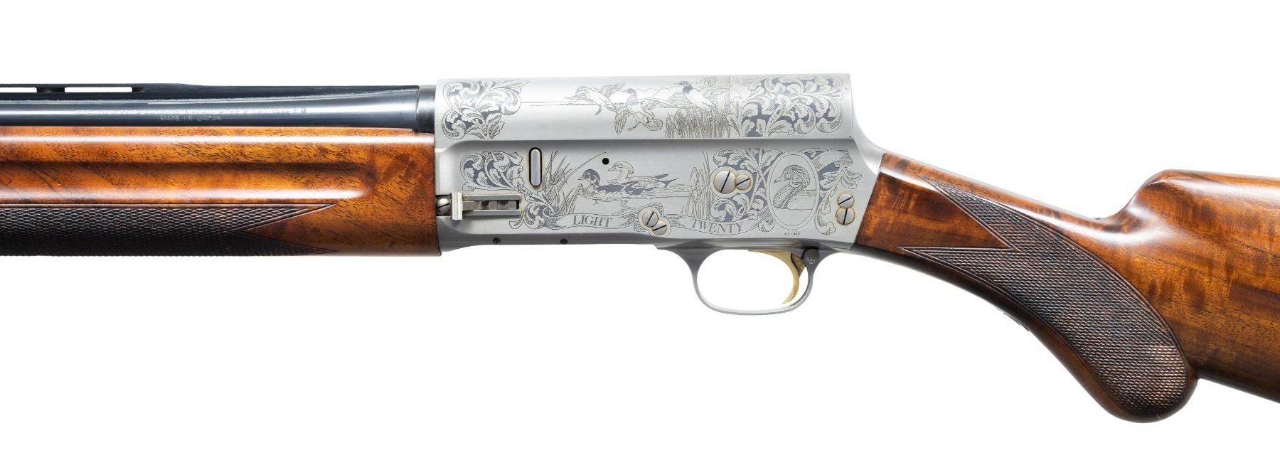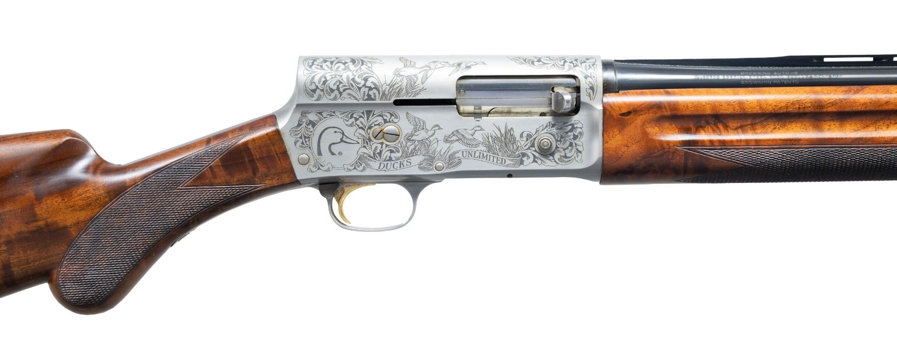 AUCTION AUTO-LOADING SHOTGUN. Cal. 20 GA, 2 3/4". S# 90DU001677. Bbl. 26" vent rib with Invector interchangeable chokes, Mod tube included. Bright finished action with special Ducks Unlimited ornamentation. Left side of receiver engraver's marking "M. TIKAMORI". Gold finished trigger. Forearm and rnd. knob stock of fancy walnut have cut checkering. LOP: 14 1/4" over original buttplate. Limited production of 4,500 mfg. in 1990 only. CONDITION: bbl. and action retain over 98% original finish showing a couple of small scratches. Stocks have lightly worn finish showing scattered scratches and marks. Bright near excellent bore. (25-5138/DS). MODERN. $1,200-1,800.