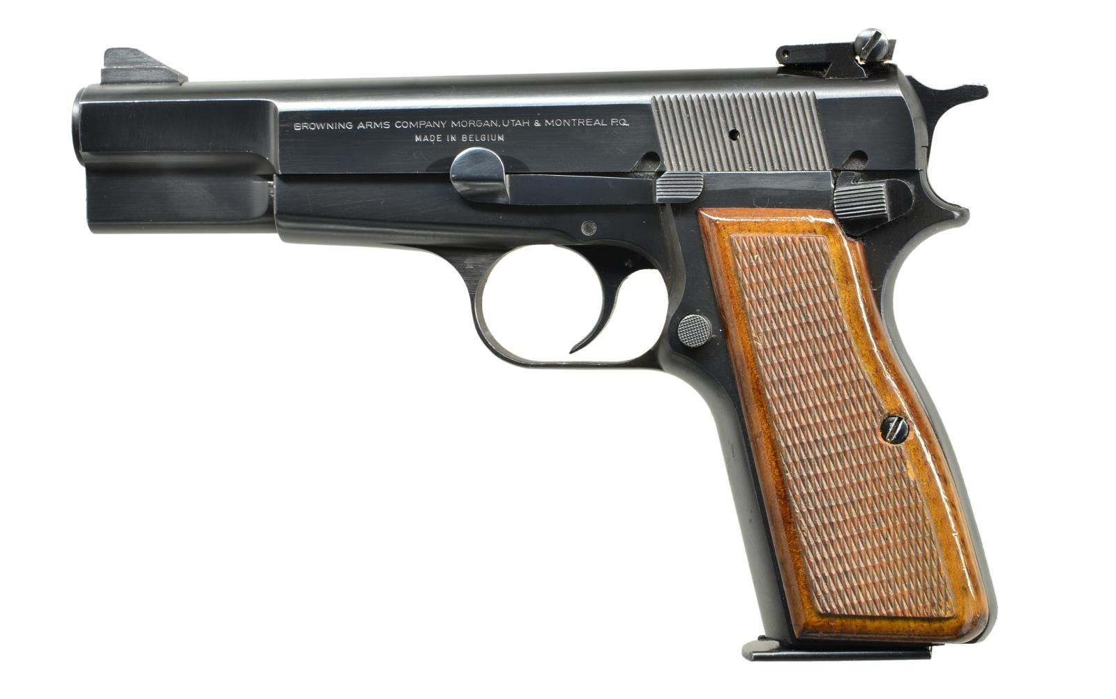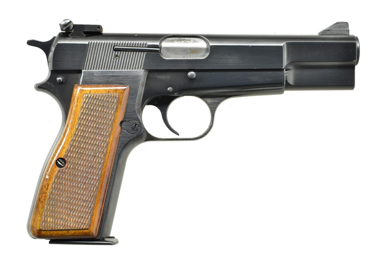Cal. 9mm. S# 245RP20088. Bbl. 4 5/8". Serrated ramp front with adjustable rear sight. Polished blue finish. Checkered walnut 2 piece grips. Mfg. 1978 in Belgium. MAGS: 1 original detachable 13 round. CONDITON: over 97% blue showing small scratches. Grips show a few small  marks. Bright near excellent bore. (22-3966/DS). MODERN. $900-1,400.