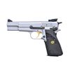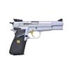 Cal. 9mm. S# 245NW71348. Bbl. 4 5/8". Dovetail mounted serrated ramp front sight with added orange highlighter. White outline square notch adjustable rear sight. Satin nickel finish. Gold finished trigger. Signature Model checkered rubber grips with gold Browning medallions. Made in Belgium, assembled in Portugal in 1994. MAGS: 1 - 13 round original. CONDITION: over 97% metal finish showing spots of hardened grease. Gold finished trigger shows edge wear. Very good bright bore. (22-3981/DS). MODERN. $800-1,200.