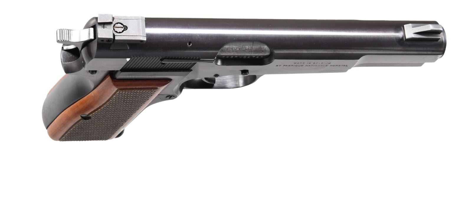 Cal. 9mm Luger. S# 245PW04748. Bbl. 4 5/8". Ramped blade front sight. Adjustable rear sight. Belgian made Hi Power pistol. Blued finish. Mfg. 1984. Checkered hardwood grips. MAGS: 1-13 rd. UNATTACHED ACCESSORIES: aftermarket black hardcase. CONDITION: grips show some dings & handling marks. Metal retains 93% original blue w/ some freckling on backstrap, scattered handling marks & some light edge wear. Very good bright bore. (23-7144/MJC). MODERN. $700-1000.
