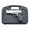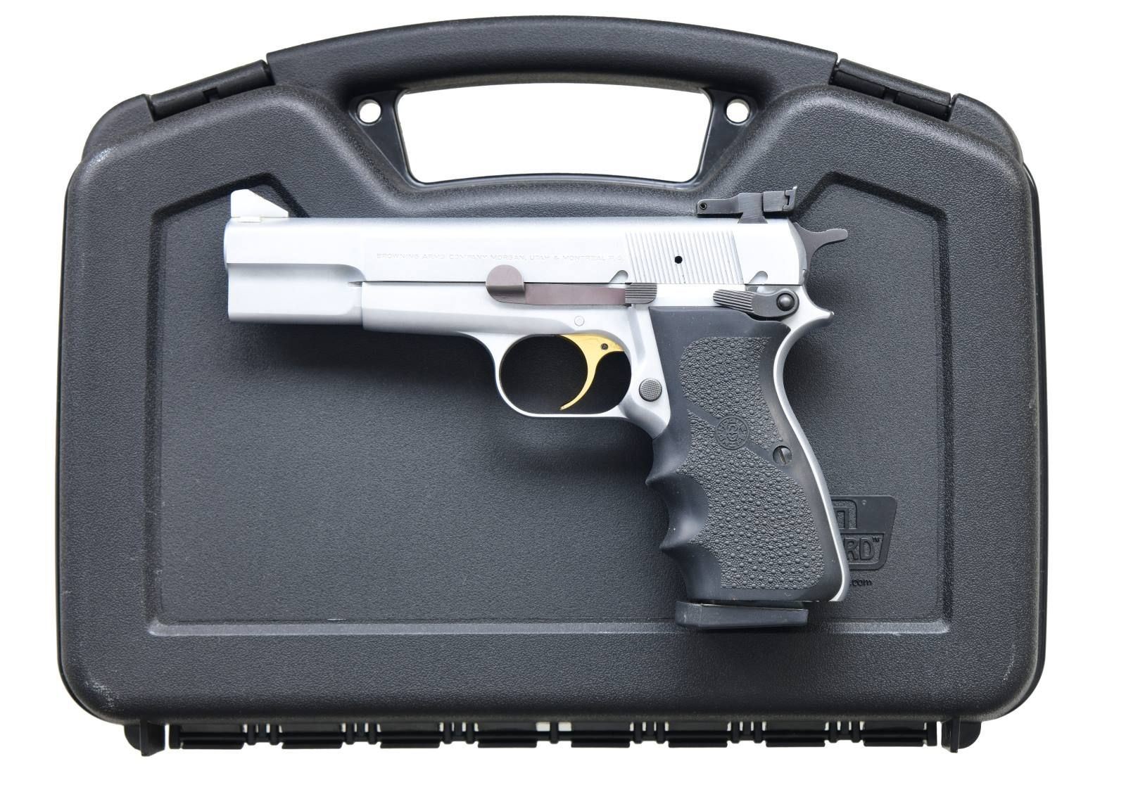 Cal. 9mm Luger. S# 245NZ59877. Bbl. 4 5/8". Ramped serrated blade front sight. Adjustable rear sight. Portuguese assembled Hi Power pistol mfg. 1991. Mag disconnect safety disabled. Matte chrome finish with gold trigger. Extended ambi safety. Hogue finger groove grip. MAGS: 1-13 rd. UNATTACHED ACCESSORIES: aftermarket black hardcase. CONDITION: all aspects are near excellent. (23-7147/MJC). MODERN. $700-1,000.
