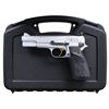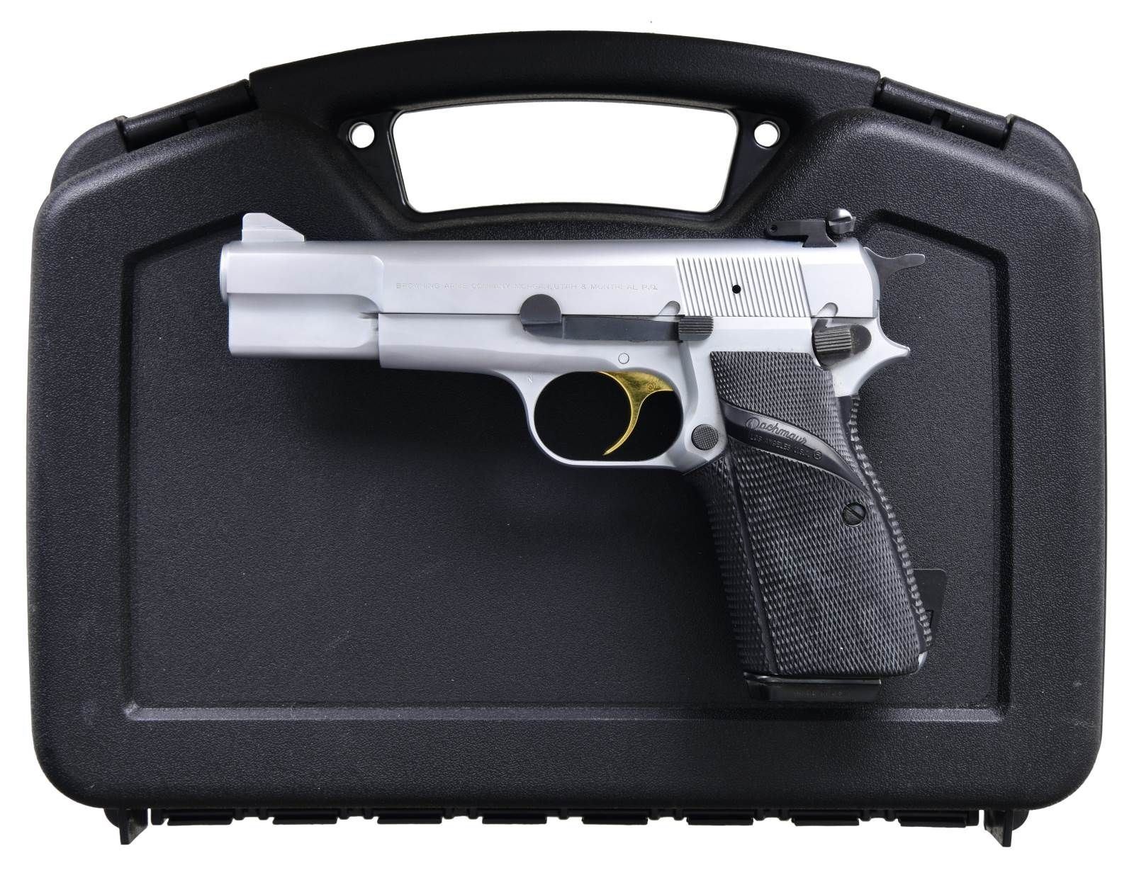 Cal. 9mm Luger. S# 245PZ96761. Bbl. 4 5/8". Serrated blade front sight. Adjustable rear sight. Mfg. 1981. Chrome finish with a gold trigger. Pachmayr Signature grips. MAGS: 2-10 rd. UNATTACHED ACCESSORIES: aftermarket black hardcase. CONDITION: all aspects rate very good-plus or better, with some light handling and operational wear. (23-7148/MJC). MODERN. $700-1,000.