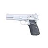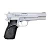 Cal. 9mm Luger S# 71C37969. This Browning Hi-Power features a stainless type finish. The barrel length is approximately 4.7 inches. The front sight is a fixed blade with a red paint, and the rear sight is an adjustable notch. The left side of the slide is marked with "BROWNING ARMS COMPANY ST LOUIS MO & MONTREAL PQ". The frame has a left-side thumb safety and a magazine release located at the bottom of the trigger guard. The grips are checkered black plastic with the "Pachmayr" logo. MAGS: 1-13 Rds. CONDITION: Overall very good condition. The slide retains approximately 85% of its stainless type finish. The frame retains 80% of its finish. The trigger and hammer show minimal wear. The bore is bright with strong rifling. MODERN (24-2394) $500-800