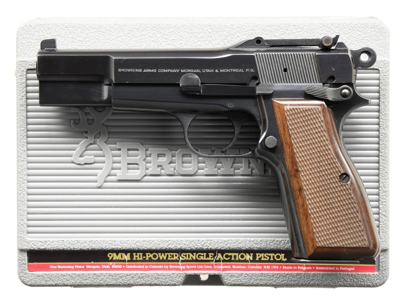 MATCHING FACTORY CASE. Cal. 9mm Luger. S# 245NW69327. Bbl. 4 5/8". Hi-Power semi-automatic pistol mfg. in Belgium, assembled in Portugal and imported/retailed by Browning Arms Company of Morgan, UT in 1994. Left side of slide exhibits Browning's importer/retailer information with "MADE IN BELGIUM/ ASSEMBLED IN PORTUGAL" stamped on the right. Metal components exhibit a blued finish, with the bbl. being polished in-the-white. Frame is mounted with 2 piece checkered wood grips. Tangent rear sight with dovetailed blade front sight and ambidextrous safety catch. MAGS: 2 - 13rd. UNATTACHED ACCESSORIES: matching factory hard case containing spare mag. CONDITION: metal components retain the vast majority of their original factory blue finish, exhibiting some very mild edge wear on the slide and mild to moderate amounts of oxidation on the grip straps. Mirror bore, exhibiting well defined rifling throughout. Grips show some mild smoothing and a few small nicks, but are otherwise very good overall. (23-4982/MLW). MODERN. $700-1,000.