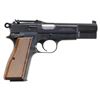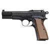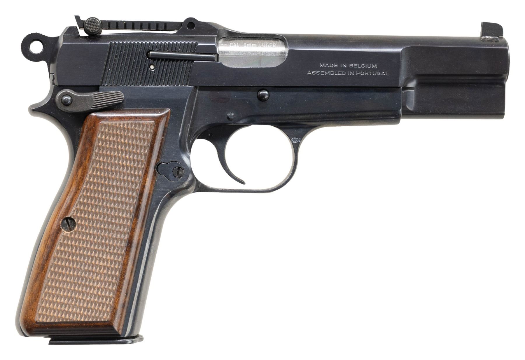 TANGENT SIGHT. Cal. 9x19mm. S# 245NW72321. Bbl. 4 5/8". Hi-Power semi-automatic pistol mfg. in Belgium by Fabrique Nationale, assembled in Portugal, and imported/retailed by Browning Arms Company in 1994. Left side of the slide is marked with Browning's importer information, with "MADE IN BELGIUM/ ASSEMBLED IN PORTUGAL" marked on the right. Metal components exhibit a blue finish overall, save for on the 2-piece bbl., which is polished in-the-white. Frame is mounted with 2-piece gloss finished checkered wood grips and features an ambidextrous slide safety lever. Slide features an external extractor with a dovetailed blade front sight and square notch tangent rear sight graduated 50-500. MAGS: 1 Italian mfg. 13-rd. mag. CONDITION: fine, with metal components retaining virtually all of their original factory blue finish, showing a few light superficial handling marks, with a couple of spots of discoloration on the slide. Brilliant mirror bore, retaining well defined rifling throughout. Proper manual mechanics. Grips are excellent overall. (25-4643/MLW). MODERN. $700-1,000.