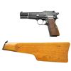 Cal. 9mm Luger. S# 82712. Bbl. 4 3/4" with S#82712 & eagle party symbol. Mfg. April to December 1941; S# 65285 to 93000. Approximately 27,715 produced w/ tangent sights & cut for stock. Quality pre war fit & finish w/ occasional broken parts due to sabotage. No sabotage w/ this pistol. Border checkered walnut grips usually having red paint to seal the wood preventing moisture build up that can rust the frame; these grips not painted indicating later 103 production when grip stockpile depleted. "WaA" on left side of slide above slide latch plus on end of slide below muzzle along w/ eagle party symbol proof; "MR" on left front of triggerguard. Matching numbered frame, slide & bbl. Tangent sight marked 50-500. MAGS: 1 matte finished 13 rd. w/ aluminum follower & split tail base having minimal finish & scratched with "REM" plus "3684". Function wear on body of Mag. UNATTACHED ACCESSORIES: a nicely refinished Belgian Army shoulder stock w/ correct features of flush unused & pre drilled rivet holes; no holster. Proper acceptance mark of "AC.35"; "5" barely readable. Missing holster attachment loop & iron. Loose fit to pistol. CONDITION: very good to excellent appearance as professionally restored w/ very crisp markings. Very slight fine oxidation at lower rear corner of port area on slide & at rear on left side. Very slight high point wear at front of slide & edges of hammer spur. Very light prior pitting on front of sight & bbl. at port. Very light trigger area wear yet near excellent grip straps. Good to very good grips w/ light hand wear & small marks; reduced finish on attachment screws. Near excellent bore. (22-4760/NW). CURIO. $1,500-3,000.
