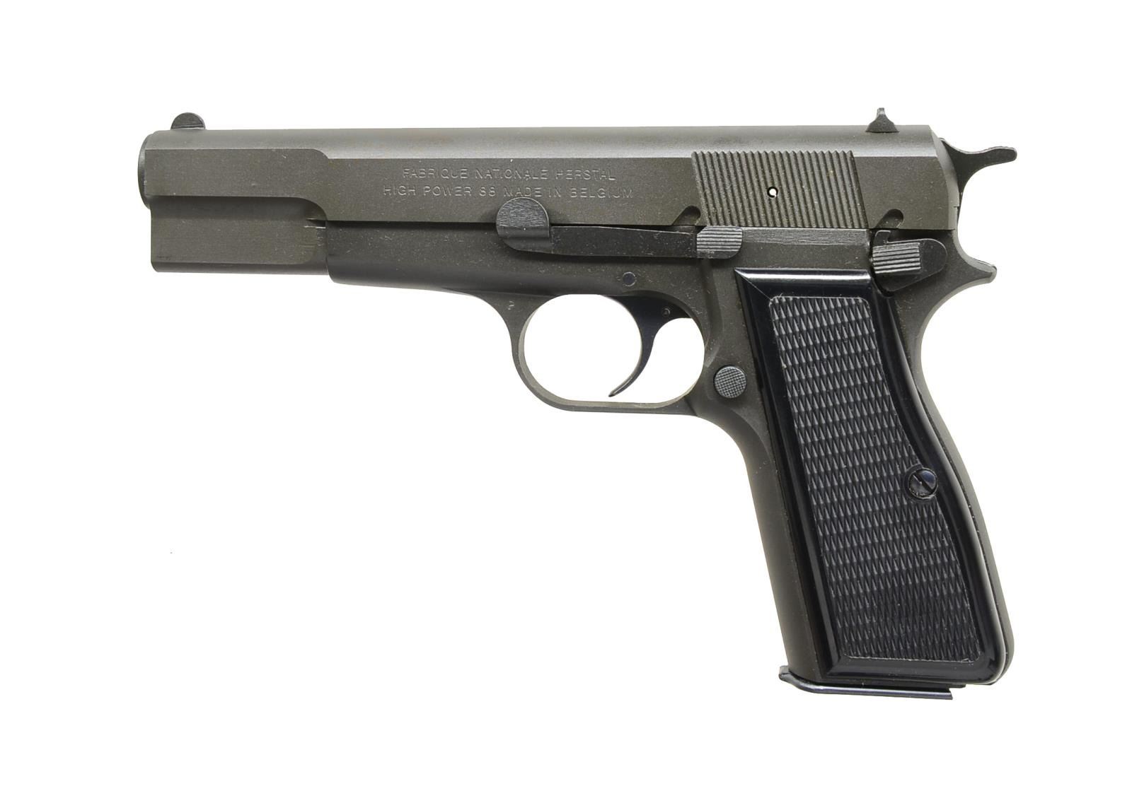 Cal. 9mm PARA (9mm Luger). S# 245PZ45596. Bbl. 4 5/8" w/ matching S# plus matching slide. Mfg. 1981 in Belgium & imported by Howco Dist. Matte blue finish throughout having checkered black plastic grips, spur hammer & in the white bbl. MAGS: 2 factory 13 rd. w/ black plastic followers, push button bases & bodies marked w/ PI symbol. CONDITION: all aspects including bore & grips are near excellent appearing new & unfired. (21-2842/NW). MODERN. $700-1,000.