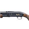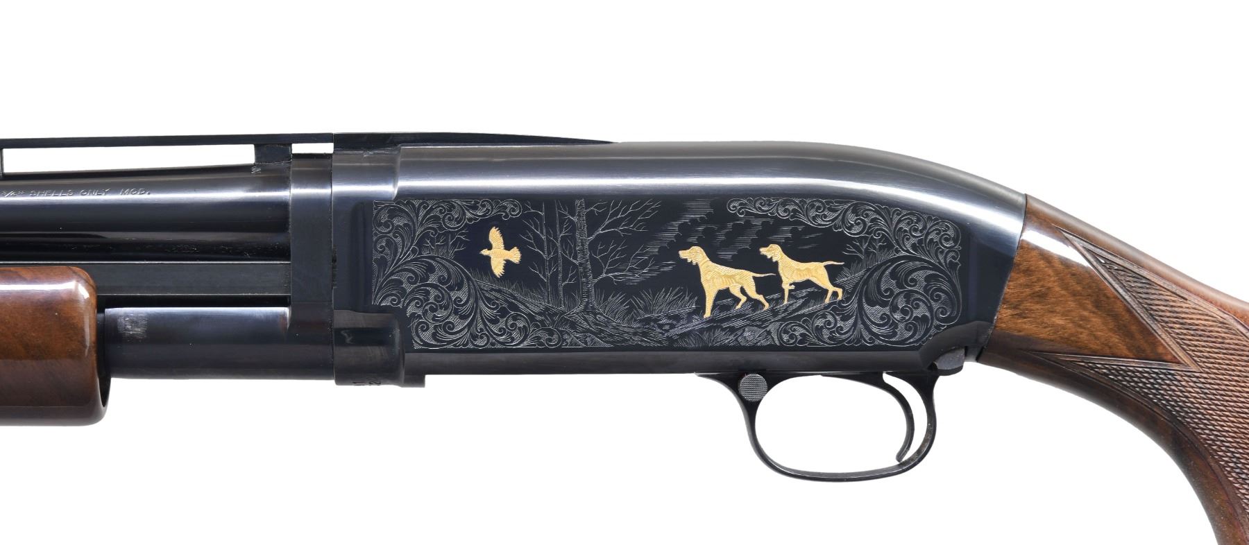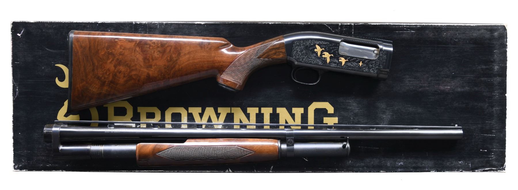 Cal. 20 ga. 2 3/4". S# 03191PN932. Bbl. 26" vent rib w/ fixed Mod choke & steel front bead. Action has four gold plated mallards on right side w/ two pointing dogs & flushing partridge on left side. Scenes are surrounded by vine type foliate scroll w/ punch dot backgrounds. High polish blue. Beavertail forearm & steel capped pistol grip stock of fancy walnut having gloss finish, cut checkering & plastic buttplate. Limited edition of 4,000 mfg. in Japan in 1988 only. UNATTACHED ACCESSORIES: original foam-lined black box, containing instruction booklet. CONDITION: as new, appears unfired, retaining over 99% wood & metal finish. Mag. tube shows light slide marks. Bright near excellent bore. (25-731/DS). MODERN. $1,800-2,500.