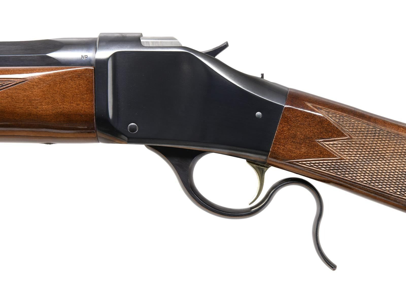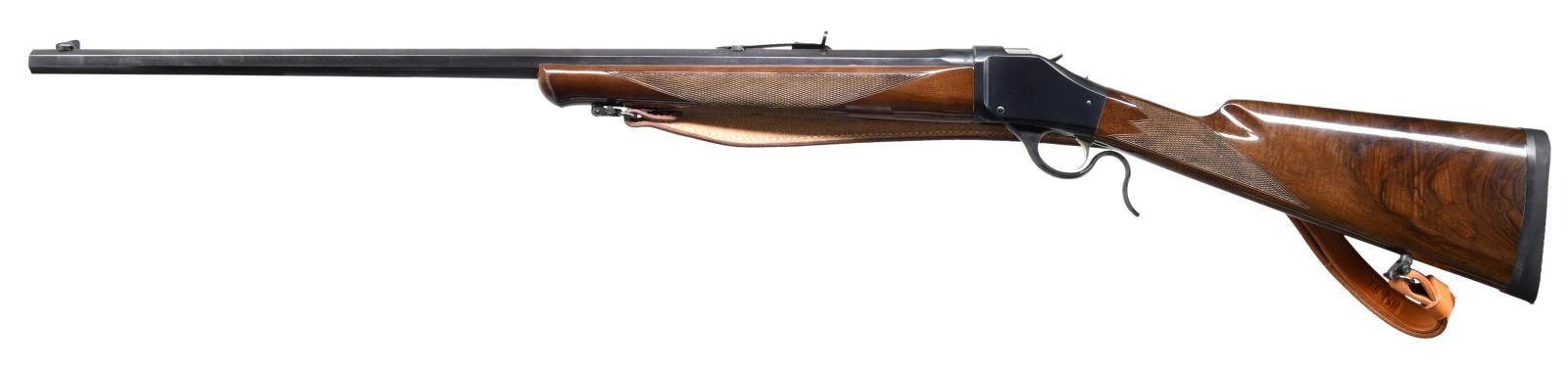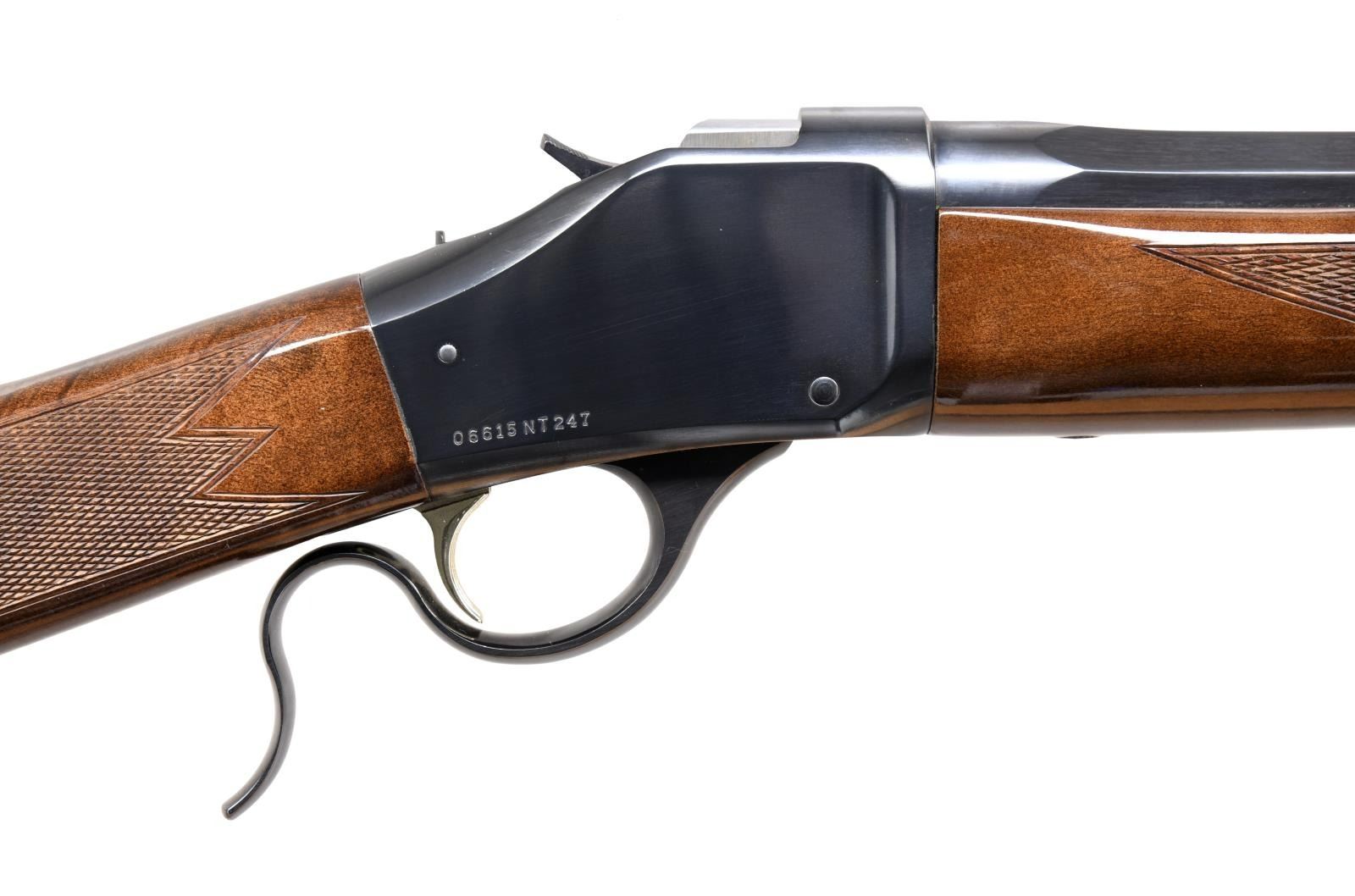 BREECHLOADING RIFLE. Cal. 45-70. S# 06615NT247. Bbl. 28". Model 1885 High Wall single shot breechloading rifle mfg. in Japan and imported/retailed by Browning Arms Company. The left side of the octagonal bbl. is marked with Browning's importer information above "MADE IN JAPAN", with the model and cal. designations marked on the right. Right side of receiver is marked with the S#. Metal components exhibit a blue finish. Checkered wood straight grip buttstock and schnabel tip forend. Blade front sight with semi-buckhorn square notch rear sight. CONDITION: excellent, with metal components retaining bountiful amounts of their original factory finish, exhibiting few light superficial handling marks overall. Mirror bore, exhibiting well defined rifling throughout. Wood furniture is very good to excellent overall. (24-881/MLW). MODERN. $700-1,000.