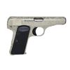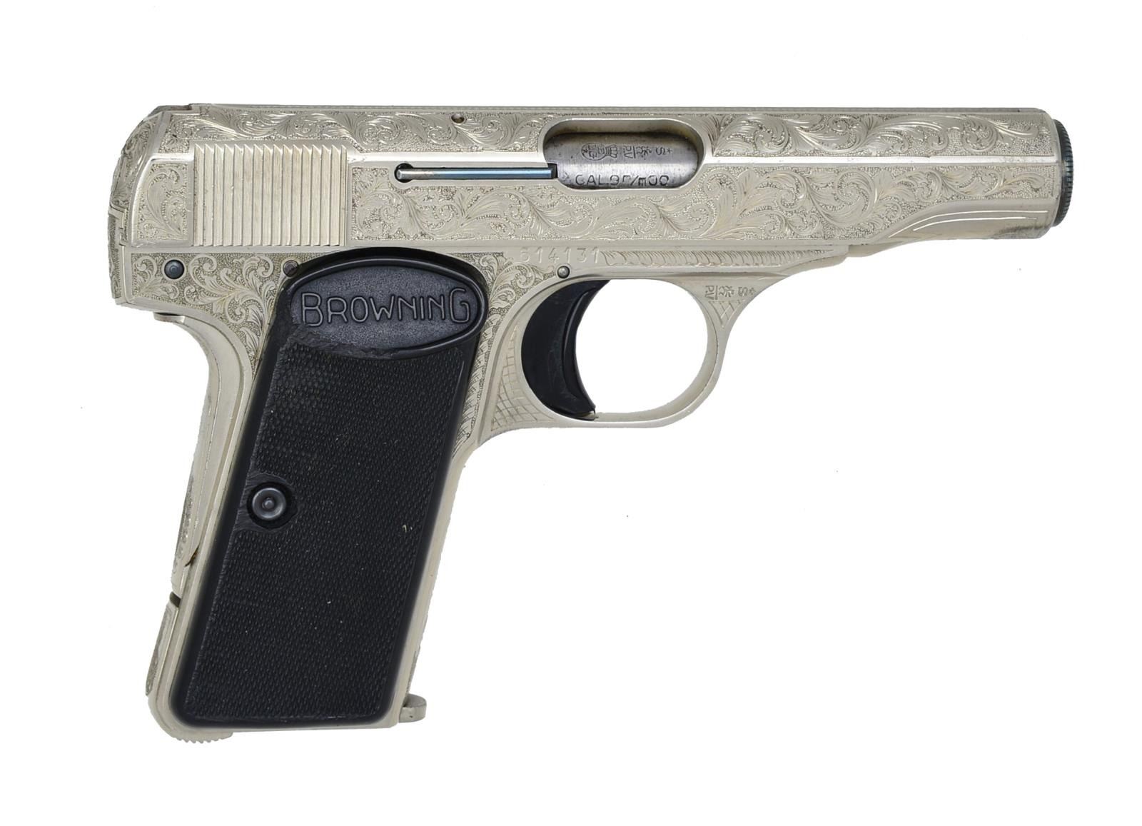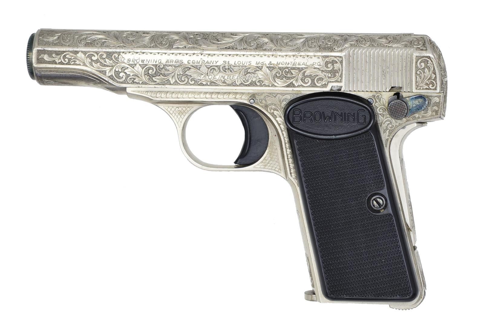 SEMI AUTO PISTOL. Cal. 380 ACP. S# 614131. Bbl. 3 7/16". Left side of slide marked "BROWNING ARMS COMPANY, St. LOUIS, Mo & MONTREAL P.Q." & "MADE IN BELGIUM". Finely executed Renaissance style engraving consists of vine type foliate scroll w/ punch dot background & crosshatch highlights that extend to grip straps & trigger guard. Full coverage nickel finish including mag. 2 Piece checkered plastic grips. 1968 Mfg. MAGS: 1 FN marked 6 rd. CONDITION: gun retains over 98% nickel finish showing spots of freckling & sm. wear spots. Black synthetic trigger shows some distortion. Right grip panel shows scrapes along top & back areas. Bright bore w/ strong rifling. (20-3766/DS). CURIO. $1,000-1,500.