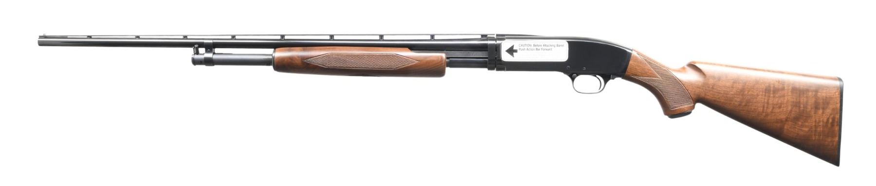 SHOTGUN WITH MATCHING BOX. Cal. 410, 3". S# 01406NZ882 (1991). Mfg. by Miroku of Japan with VR 26" barrel. Brass bead & Full choke. Select Walnut stock set. WEIGHT: 6 lbs., 12 oz. UNATTACHED ACCESSORIES: matching numbered box containing manual & hang tags. CONDITION: near excellent wood & metal finish with caution sticker on receiver. Bright shiny bore. (24-2917/MD). MODERN. $800-1,200.