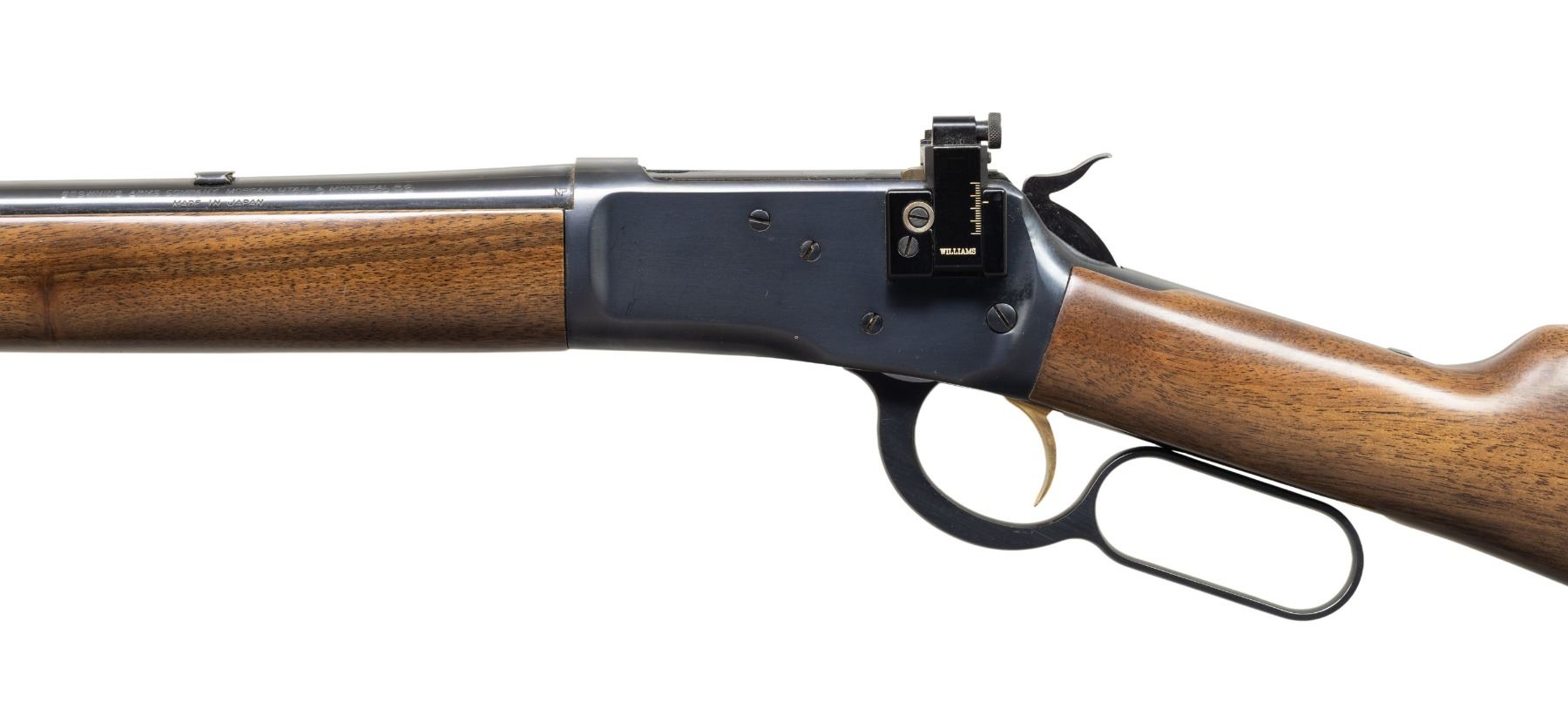 Cal. 44 Mag. (.44 Remington Magnum). S# 02094PM167. Bbl. 20". Model 92 lever action carbine mfg. in Japan and imported/retailed by Browning Arms Company in 1980. Left side of the bbl. is marked with Browning's importer information above "MADE IN JAPAN", with the model and cal. designations marked on the right. Metal components exhibit a blue finish overall, save for on the trigger, which exhibits a gold colored finish. Plain wood forearm and straight grip buttstock with blued steel carbine buttplate. Fixed blade front sight with blank in rear sight dovetail and receiver mounted Williams adj. aperture rear sight. CONDITION: metal components retain the vast majority of their original factory blue finish, exhibiting some superficial handling marks, as well as a few scattered pinprick patches of light surface oxidation. Mirror bore, exhibiting a few spots of apparent light surface oxidation towards the muzzle, while retaining well defined rifling throughout. Proper manual mechanics. Wood furniture shows some marks and minor impressions from handling and storage, but otherwise remain sound. PROVENANCE: Estate of Groves Herrick. (25-6146/MLW). MODERN. $350-550.