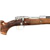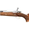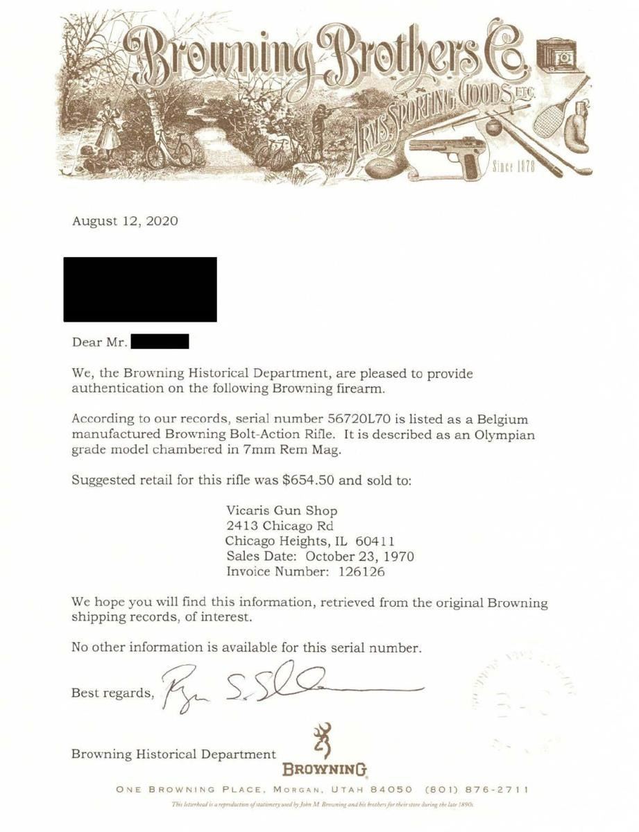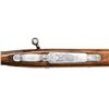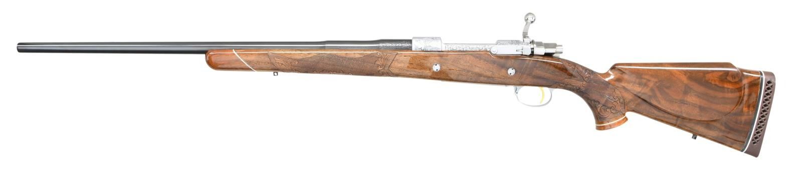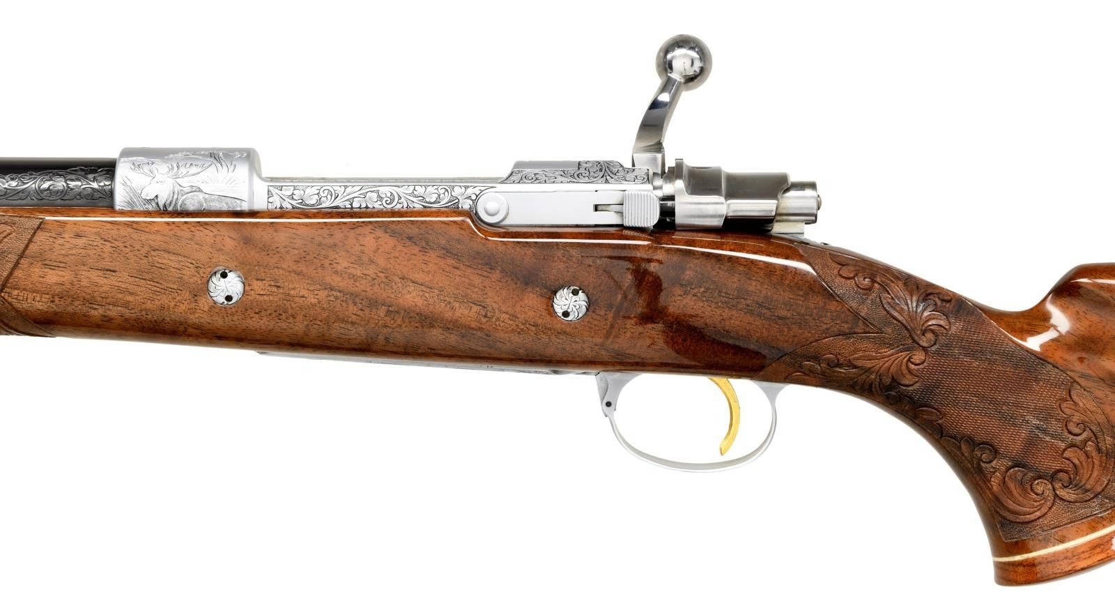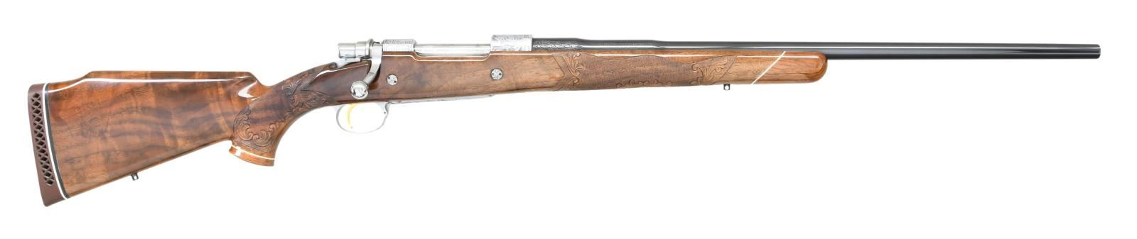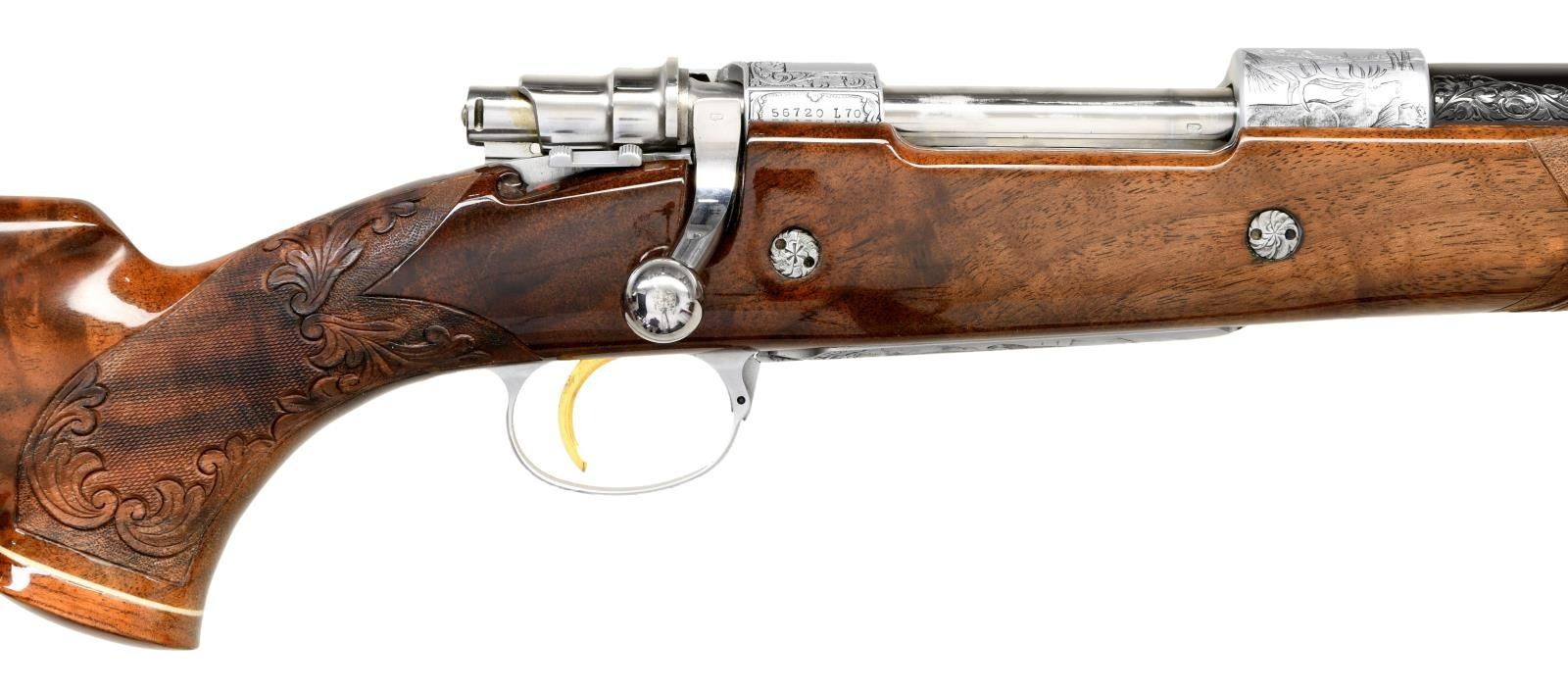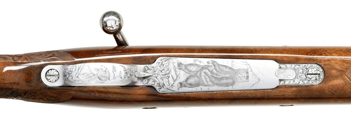 ACTION RIFLE. Cal. 7mm Rem Mag. S# 56720L70. Bbl. 24" sporter weight without sights. FN short extractor action with satin chrome finish & right side safety. The bolt is numbered to the rifle. Receiver & bottom metal have foliate scroll hand engraving surrounding scenes that feature elk & moose on the front receiver ring. The floorplate features a standing grizzly & the trigger guard depicts a snarling mountain lion. The engraving is triple signed by Angelo Bee, Severin & Cortis. Gold finished trigger. Monte Carlo cheekpiece stock of gloss finished fancy walnut has the original Browning pad. Features include contrasting forend tip & grip cap with white line spacers and swivel bases. Fine hand checkering on wrist & forend is bordered by elaborate floral carving with stippled backgrounds. Weight, 8 lbs., 10 ozs. 1970 Belgium mfg. UNATTACHED ACCESORIES: Browning letter confirming Olympian grade and further stating: "sold to: Vicaris Gun Shop / 2413 Chicago Rd / Chicago Heights, IL 60411 / Sales Date: October 23, 1970 / Invoice Number 126126". CONDITION: Bbl & action retains over 99% finish. Very good stock shows small spots of darkening in checkering. The recoil lugs are bordered by darkened wood, however when removed from the stock the bbl. & action show no salt related damage. Bright near excellent bore. PROVENANCE: From the Estate of Jon Thomas. (23-1650/DS). CURIO. $5,000-8,000.