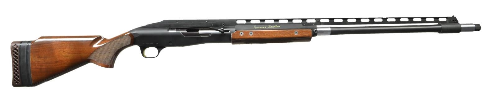 Cal. 12 Ga., 2 3/4" (trap loads only). S# 05742NW869 (1994). The 26" bbl. is fitted with very high adjustable ventilated rib. Bbl. is also fitted with “Invector Plus” choke. Unique bolt action type recoilless action eliminates up to 72% of felt recoil. Pistol grip American walnut stock measures 14 1/4" and is fitted with adjustable "Browning" marked open sided pad. Stock also has Monte Carlo comb and modified point pattern grip checkering. Matching forend doubles as cocking lever. MEASUREMENTS: STOCK: DAH: presently 2 1/8". DA REAR OF MONTE CARLO: 1 1/2". DAC: 1 1/2". LOP: 14 1/4". CAST: approx. WEIGHT: 9 lb. 3 oz. CONDITION: fine with a few scattered scratches in finish with high edge wear. Stock also has a few nicks and dings. Bright shiny bore. (23-21/MGM/MD). MODERN. $300-500.