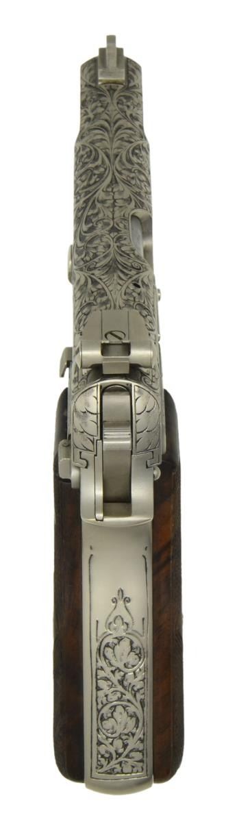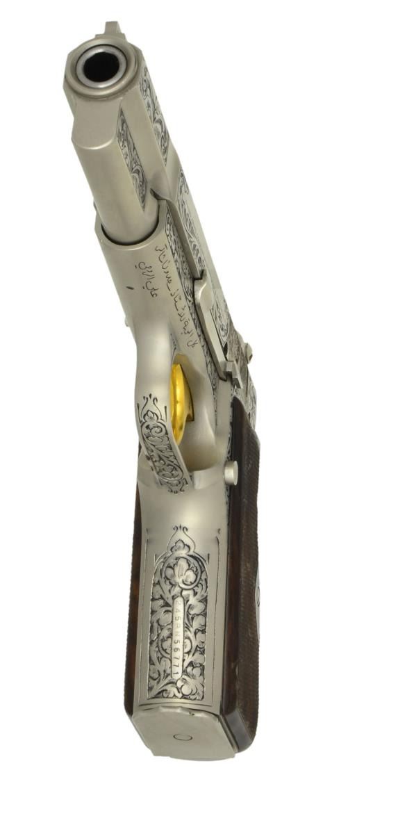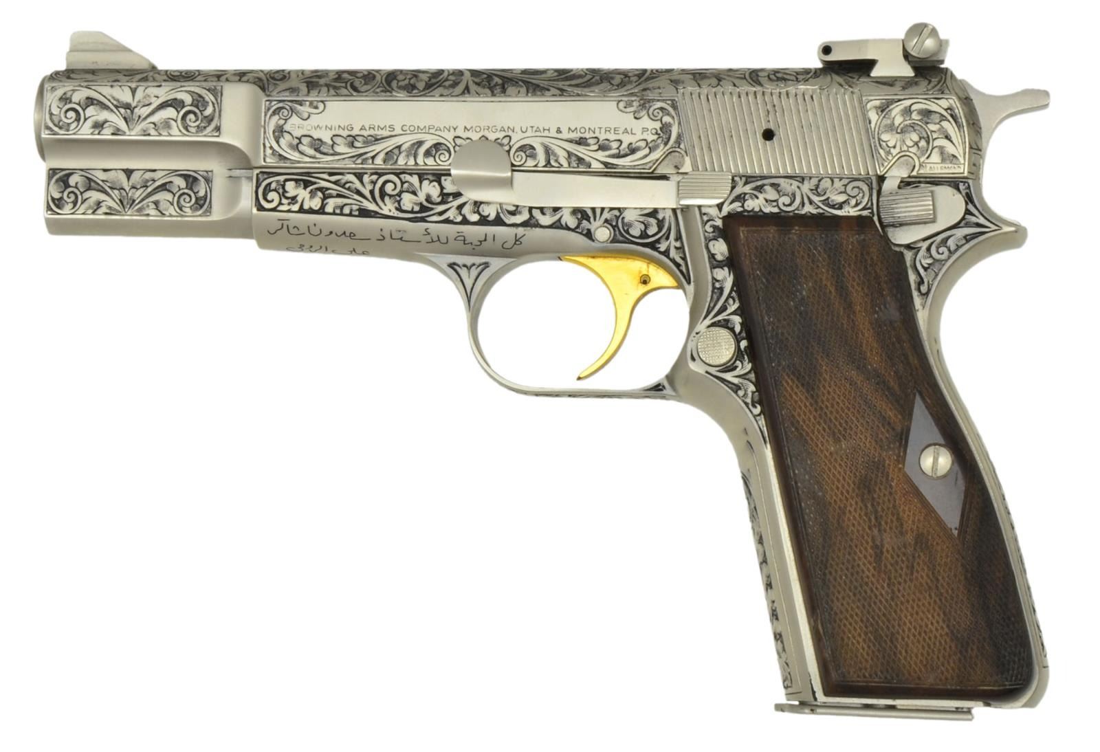 Cal. 9mm. S# 245RN56771. Bbl. 4 5/8". Serrated ramp front sight with square notch adj. rear sight. Gray silver-finished slide & action with Renaissance-grade hand engraving. Full-coverage engraving consists of a vine-type foliate scroll with dark-shaded backgrounds. Bottom of the frame forward of the trigger guard has a two-line inscription in an unidentified alphabet. Gold-finished trigger. Two-piece grips of fancy thinshell walnut with fine hand checkering. Right panel has the laser-carved marking "S.SH". 1979 Belgian Mfg. MAGS: 1 detachable 15 rd. CONDITION: metal retains 90% of its finish, showing light wear with small spots of corrosion. Right grip panel is chipped at the butt. Very good bore. (23-6986/DS). CURIO. $2,500-3,500.