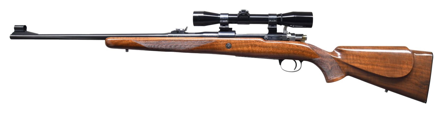Cal. 30-06. S# 3L17562. Bbl. 22 1/2". Ramped bead front sight with hood. Adjustable u-notch rear sight. Receiver mounted Browning 4x scope. Scope has duplex crosshair reticle & optics that are a bit cloudy. Matching numbers on bbl. & bolt. Belgian made Safari grade rifle. Blued finish with gold colored engraving on bottom metal. Glossy finished checkered walnut Monte Carlo stock with bottom mounted sling studs. LOP: 13 1/2". CONDITION: stock shows some light flaking & scattered handling marks. Metal retains nearly all its original blue with some light handling wear. Action functions properly when hand cycled. Bright near excellent bore. (25-1182/MJC). CURIO. $800-1200.
