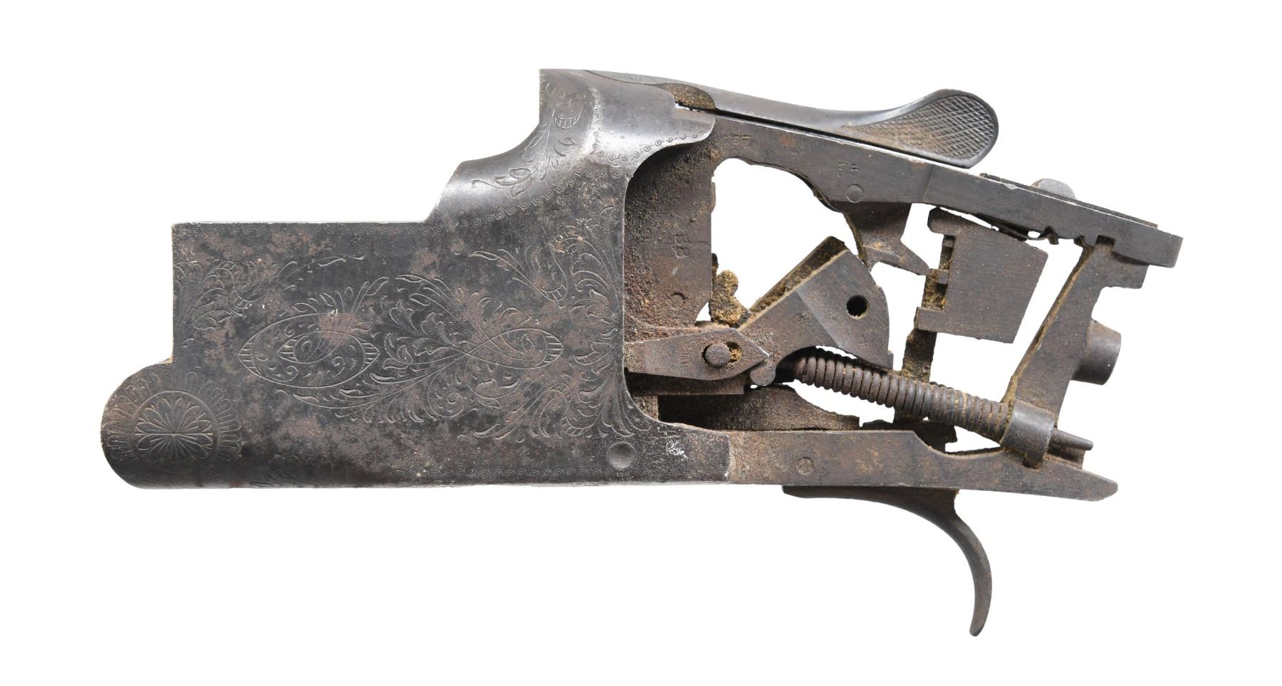 S# 44711 (1955). Grade 1 engraving meant for 12 Ga. barrels. CONDITION: finish is mix of dull blue & brown patina with oxidation. Action appears to be in need of small parts to be made functional. (24-7014/MD). MODERN. $200-600.