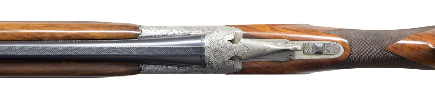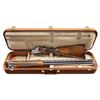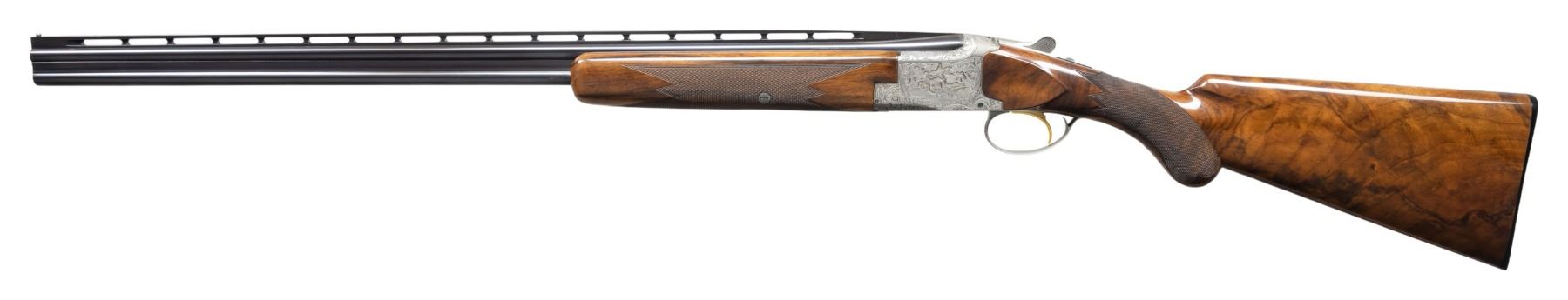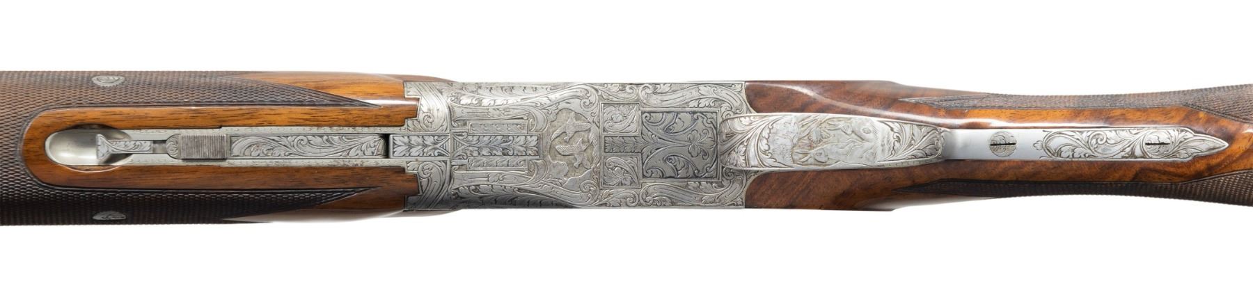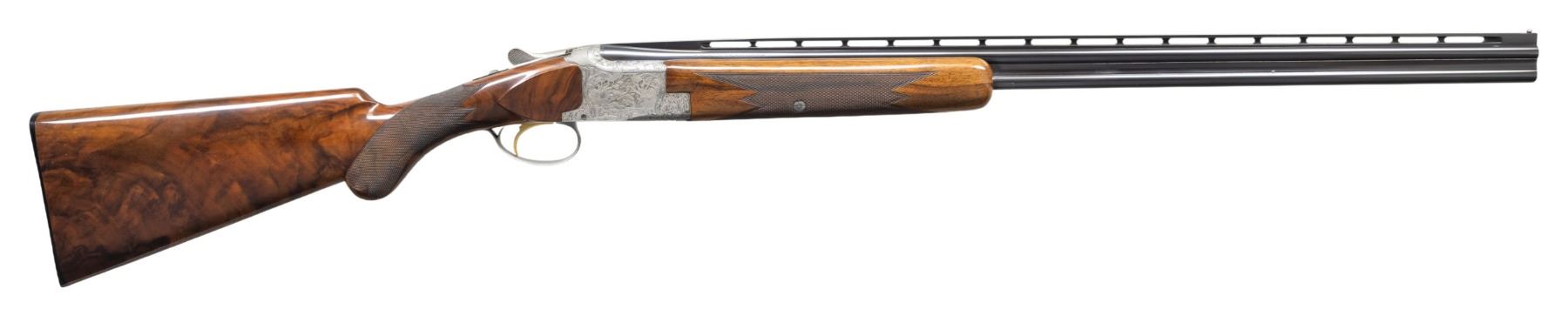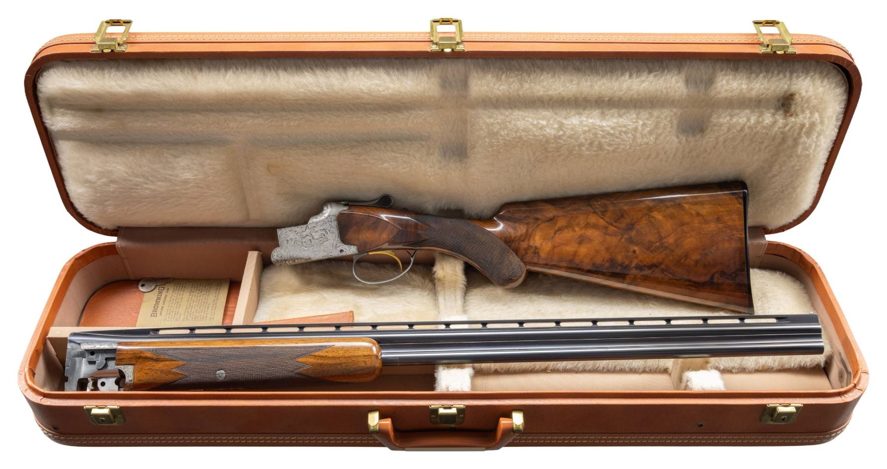 TANG O/U SHOTGUN. Cal. 410. 3". S# 662 J3. Bbl. 28" vent rib with steel bead. Fixed skeet and skeet chokes. Satin gray finished action features deep style scroll engraving surrounding game scenes. Right side game scene depicts Mallards, right side Pheasants. Floorplate shows Quail. Trigger guard bow shows Rabbits. Left side of receiver below the game scene is signed by "R. RISACK", the FN master engraver Raymond Risack specialized in engraving high grade Superposed shotguns. Features include gold finished single selective trigger, selective ejectors, non-automatic safety and barrel selector switch. Lightning forearm and round knob stock of gloss finish fancy walnut with hand checkering and original buttplate. Mfg. 1963. UNATTACHED ACCESSORIES: Browning Hartmann case with its key and instruction brochure. Case is in good condition. CONDITION: near excellent, retaining near 98% blue with only slight wear forward of the forearm. Action has very good grayed finish. Trigger retains 95% gold. Original wood finish shows scattered small marks. Tight sound action. Bright near excellent bores. PROVENANCE: Estate of Lloyd Robinson. (25-6668/DS). CURIO. $12,000-16,000.
