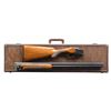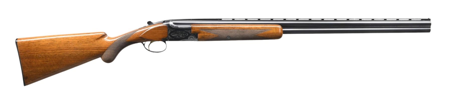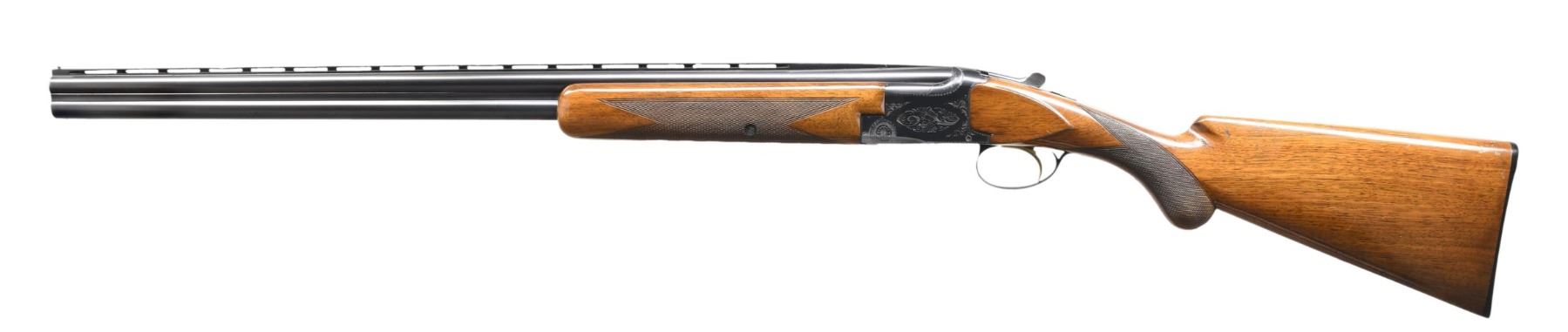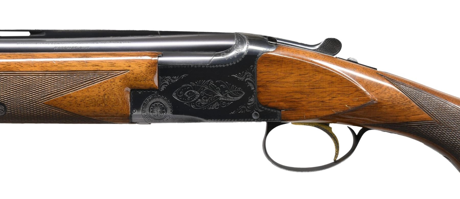 Cal. 20 ga. 2 3/4" and 3". S# 35590V5. Bbl. 28". Vent rib with steel bead. Fixed IC and Mod chokes. Blued boxlock action with Grade 1 engraving. Gold-finished SST. Selective ejectors. Lightning forearm and round knob long tang walnut stock with hand-checkering. LOP: 14 1/8" over original buttplate. Mfg. in Belgium during 1965. UNATTACHED ACCESSORIES: Browning traditional O/U case. Case contains an operation & care manual. CONDITION: over 80% original blue showing edge and carry wear. Trigger retains 40% gold finish. Original wood finish shows numerous dents, scratches, and small marks. Both sides of stock have hairline cracks extending from the receiver. Very tight action. Very good bores. (24-5873/DS). CURIO. $1,500-2,000.