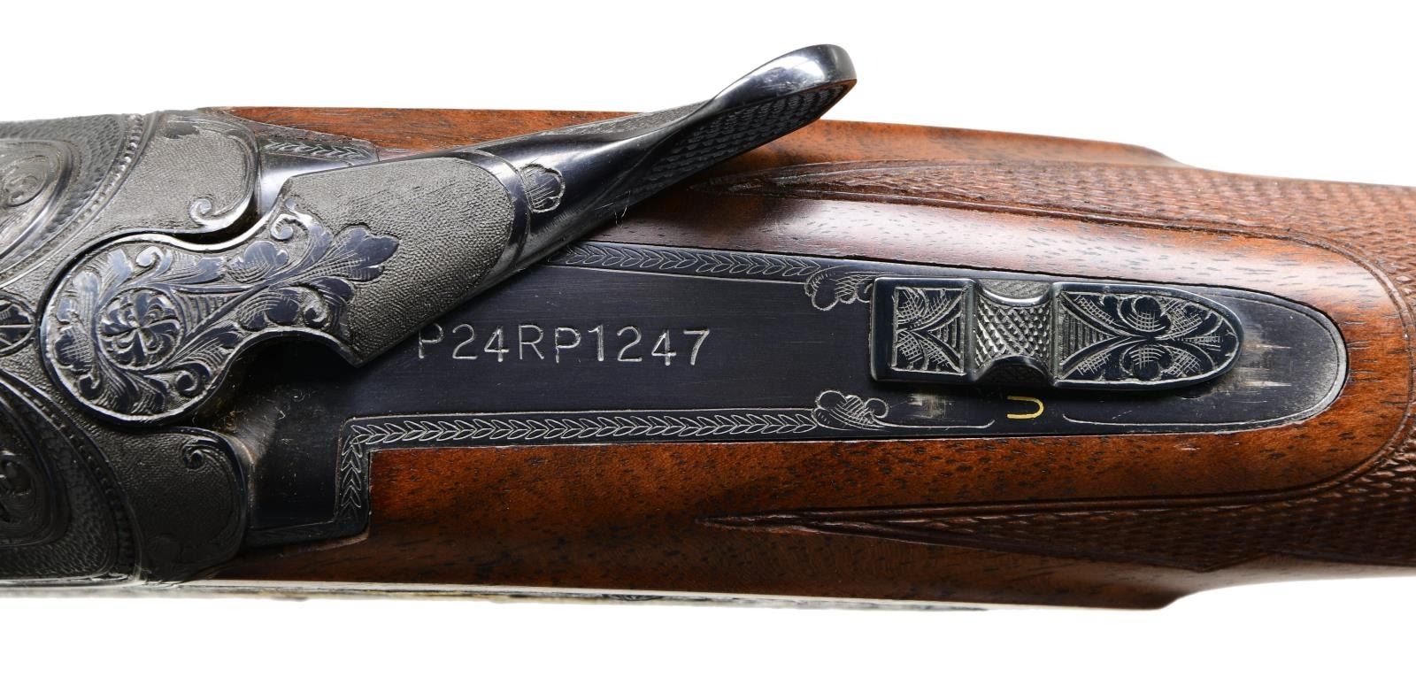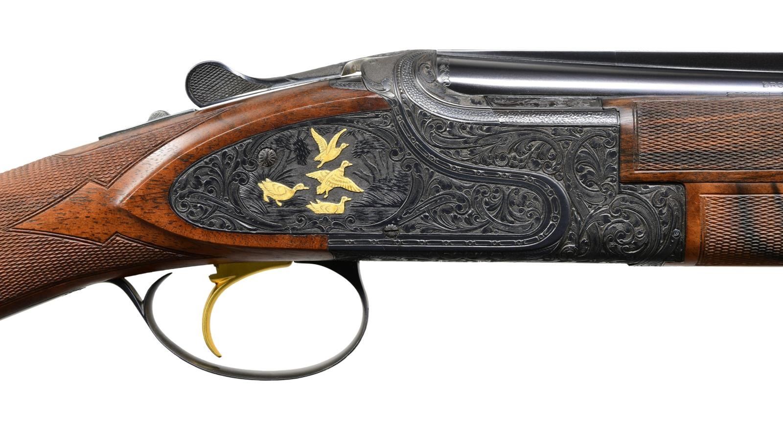 SIDEPLATED 2 GAUGE SET O/U SHOTGUN. Cal. 20ga. 2 3/4" & 410 3". S# P24RP1247. Both sets of bbls. are 26 1/2" w/ vent rib having fixed mod. & full chokes. Sideplated boxlock action w/ blued finish, selective ejectors & gold plated single selective trigger. Game scenes feature 4 gold inlaid mallards on right sideplate, 5 pheasants on left sideplate w/ a flying quail on floorplate w/ a dog's head on the trigger guard bow. Scenes are surrounded by full coverage foliate scroll hand engraving that extends to long tang trigger guard & forearm irons. The P4 was the only presentation grade shotgun that was entirely hand engraved. Engraver's signature "M. Bodson" is found on the left lockplate. Both sets of bbls. Have 3 piece forearms w/ satin finished fancy walnut w/ fine hand checkering. Straight grip stock of fancy walnut w/ fiddle figure, luxurious dark streaking & wraparound hand checkering. LOP: 14 1/8" to a checkered butt. DAC: 1 7/16". DAH: 1 7/8". WEIGHT w/ the 20 ga. bbl.: 5 lbs, 12.8 oz. 1978 Belgian mfg. UNATTACHED ACCESSORIES: gun is housed in a Browning Airways made naugahyde 2 bbl. set case. CONDITION: near excellent, appears unused, retaining virtually all original wood & metal finish. Bright near excellent bores. (24-2120/DS). MODERN. $18,000-25,000.