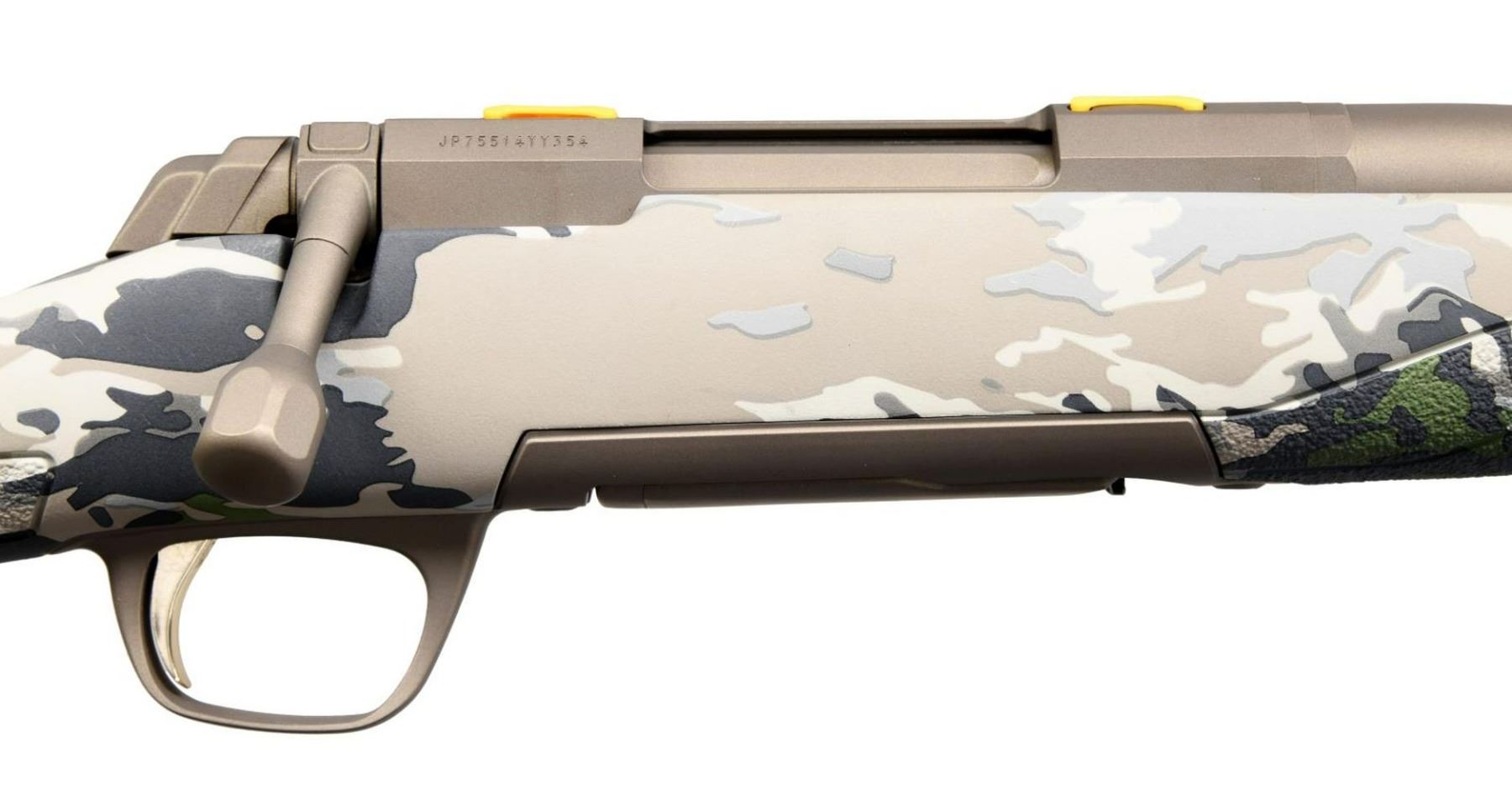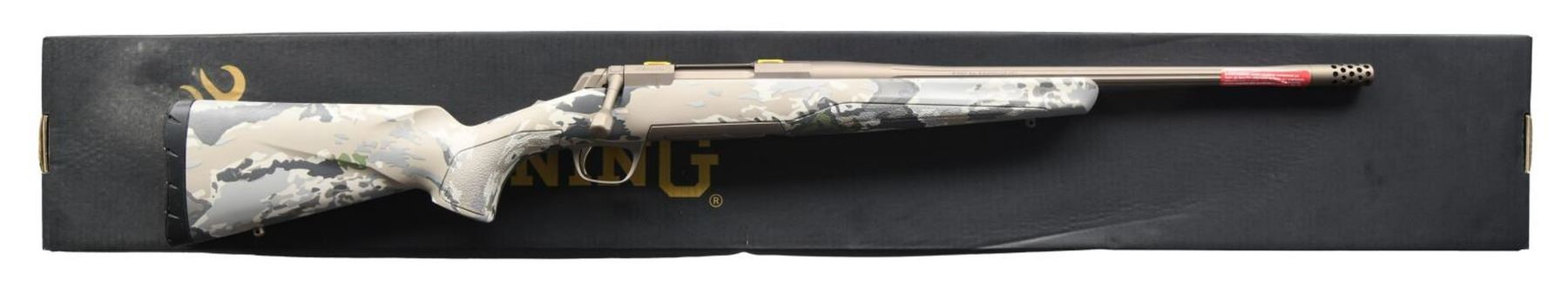 RIFLE WITH MATCHING FACTORY BOX. Cal. 6.5 Creedmoor. S# JP75514YY354. Bbl 18". X-Bolt Speed Suppressor Ready bolt action rifle mfg. by Miroku in Japan and imported by Browning Arms Company of Morgan, UT. The left side of the bbl. is marked with Browning's importer information, followed by "MADE IN JAPAN / MIROKU", with the model and cal. designations on the right. Metal components exhibit a bronze Cerakoted finish, with the trigger being gold plated. OVIX camouflage composite buttstock with textured panels at the wrist and forend. Fluted bbl with threaded radial muzzle brake. MAGS: 1 4 rnd. UNATTACHED ACCESSORIES: matching factory box. CONDITION: near new, with metal components retaining virtually all of their original factory bronze Cerakoted finish overall. Mirror bore, exhibiting well defined rifling throughout. Stock is excellent. Box exhibits mild wear overall, with some water damage on the left side of the lid. PROVENANCE: The Collection of Gun Sport Ltd owned by Jon R. Thomas. (23-3289/MLW). $800-1,200.