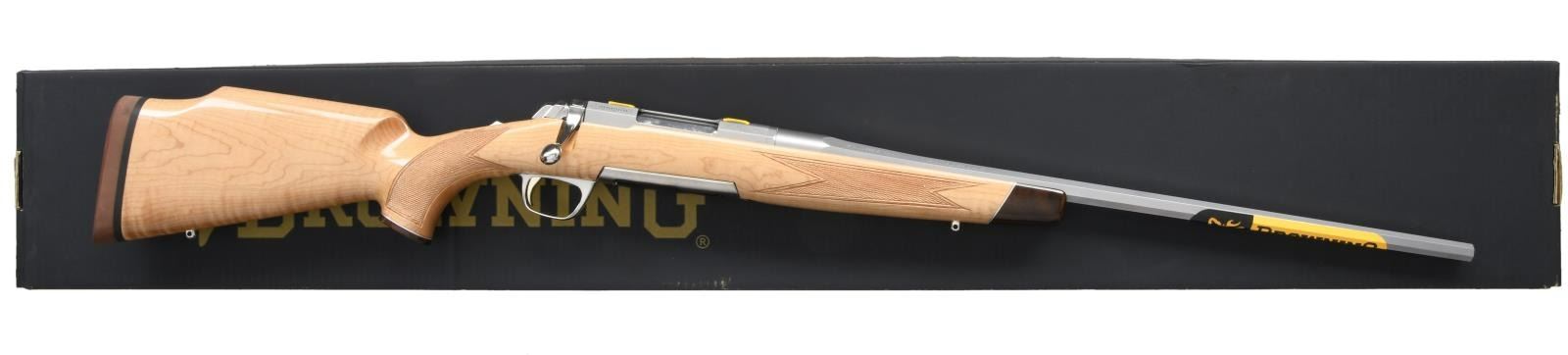 RIFLE WITH MATCHING FACTORY BOX. Cal. 270 WSM. S# JP09907YX354. Bbl 24". X-Bolt White Gold Medallion bolt action rifle manufactured by Miroku and imported by Browning Arms Company. The octagonal barrel is stamped with Browning's importer information on the left, with "STAINLESS STEEL" followed by the model and caliber designations on the right. Receiver features light scroll engraved on either side, with "WHITE GOLD MEDALLION" in gold on the left. Metal components exhibit a stainless steel finish, with the trigger featuring a gold plated finish. Maple Monte Carlo pattern stock featuring checkering at the wrist and forearm and being mounted with a Pachmayr Decelerator red rubber recoil pad. UNATTACHED ACCESSORIES: matching factory box containing its styrofoam insert and factory paperwork. CONDITION: near new, with metal components retaining virtually all of their original factory finishes overall. Mirror bore, exhibiting well defined rifling throughout. Stock is excellent overall. Box shows some mild exterior wear, but otherwise remains sturdy and serviceable. PROVENANCE: The Collection of Gun Sport Ltd. owned by Jon R. Thomas. (23-3184/MLW). MODERN. $1,200-1,800.