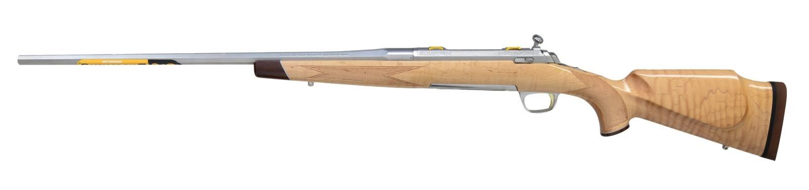 RIFLE. Cal. 280 Ackley Improved. S# JP10480YX354. Bbl. 24" tapered octagon of stainless steel w/o sights. Rifling rate of twist is 1 in 8". Stainless steel receiver w/ scroll ornamentation has provisions for X-lock scope mounts. Features include 60 degree lift bolt w/ cocking indicator, top tang safety & adj. Feather Trigger system. Monte Carlo cheekpiece stock of nicely grained gloss finished maple. Features include rosewood forearm tip & grip cap w/ metal spacers, cut checkering, swivel bases & Pachmayr Decelerator pad. MAGS: 1 detachable 4 rd. UNATTACHED ACCESSORIES: original box containing owner's manual & trigger lock. CONDITION: as new w/ box. PROVENANCE: from The Collection of Gun Sport Ltd owned by Jon R. Thomas. (23-3188/DS). MODERN. $1,100-1,500.