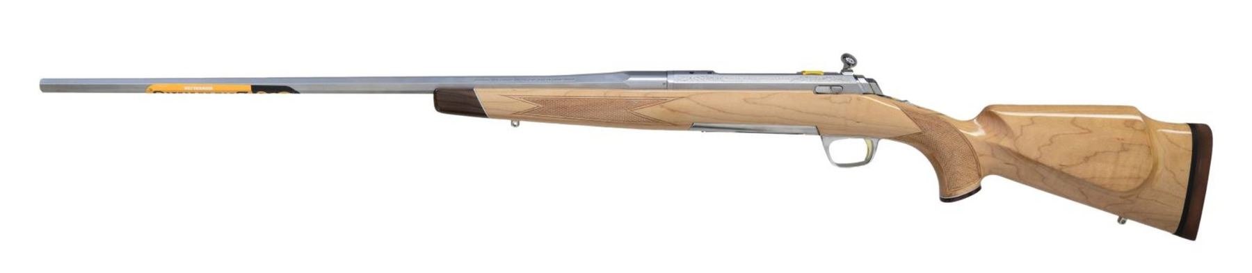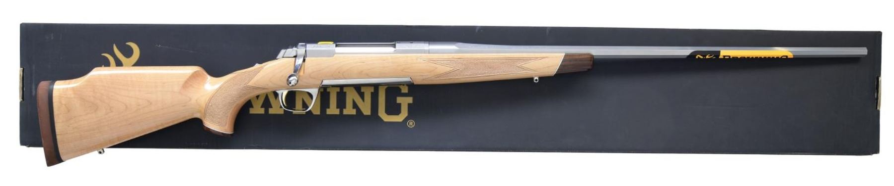 RIFLE. Cal. 7mm Remington Magnum. S# JP23556YY354. Bbl. 26" tapered octagon of stainless steel w/out sights. Stainless steel receiver w/ scroll ornamentation has provisions for X-lock scope mounts. Features include 60 degree lift bolt w/ cocking indicator, top tang safety & adj. Feather Trigger System. Monte Carlo cheekpiece stock of nicely grained gloss finished maple. Features include rosewood forearm tip, grip cap w/ metal spacers, cut checkering, swivel bases & Pachmayr Decelerator pad. MAGS: 1 Detachable 3 rd. UNATTACHED ACCESSORIES: original box containing owner's manual & trigger lock. CONDITION: as new w/ box. PROVENANCE: from The Collection of Gun Sport Ltd owned by Jon R. Thomas. (23-3194/DS). MODERN. $1,100-1,500.
