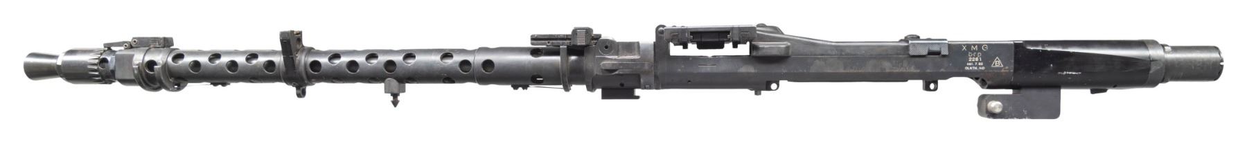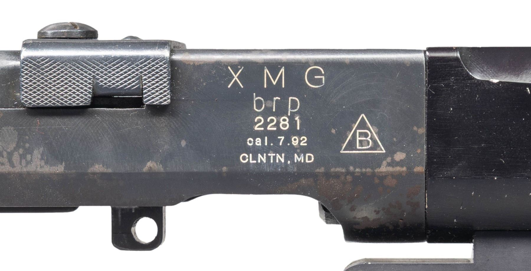 Cal. 8 mm Mauser. S# 2281. This remarkable upper receiver conversion very closely resembles a factory MG34 and provides a unique opportunity for someone to have a functioning replica of this historical gun at a mere fraction of an actual transferable original. Includes MG42/XMG front tripod mount. The XMG is fed from MG34/42 flexible metal belts. Also once offered in .308, this very unique milled steel upper receiver utilizes a standard AR 15 lower receiver to convert your black rifle to a belt fed replica of the famous German MG34. It is important to note that due to a fairly recent BATF ruling, this unique upper receiver can only be used in conjunction with a semi-auto lower receiver, or if registered by a Title II manufacturer as a Post 86 Dealer Sample, it may be utilized as a machine gun. It may not be used with a transferable registered lower receiver. Unlike traditional AR-15 upper receivers, this is treated as a firearm itself. UNATTACHED ACCESSORIES: some small stock interface parts for lower receiver. CONDITION: many of the components utilize in this kit are orig German Manufactured MG34 parts. Many have stampings and codes from orig machine gun. At least one portion of this kit is dated "1942" and top cover includes German Waffenampt proof mark, and "963". Many of the parts used with this kit are matching, but not all. Finish and overall condition is uniform w/ some scattered patina, as typical for a firearm of this era. Many stampings and markings are sharp and well pronounced. Many have been highlighted in white to ease in reading. Mechanism appears to operate correctly when cycled by hand, but we cannot be certain due to the absence of a lower receiver. (25-5772/JZ). MODERN. $6,000-10,000.