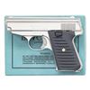 Cal. 32 ACP. S# 003968. Bbl. 2 3/4". Blade front sight. Fixed rear sight. Chrome finish. Grooved black grips. MAGS: 1-6 rd. UNATTACHED ACCESSORIES: matching numbered factory box with manual. CONDITION: all aspects rate very good or better with some usage wear. (25-4865/MJC). MODERN. $40-60.