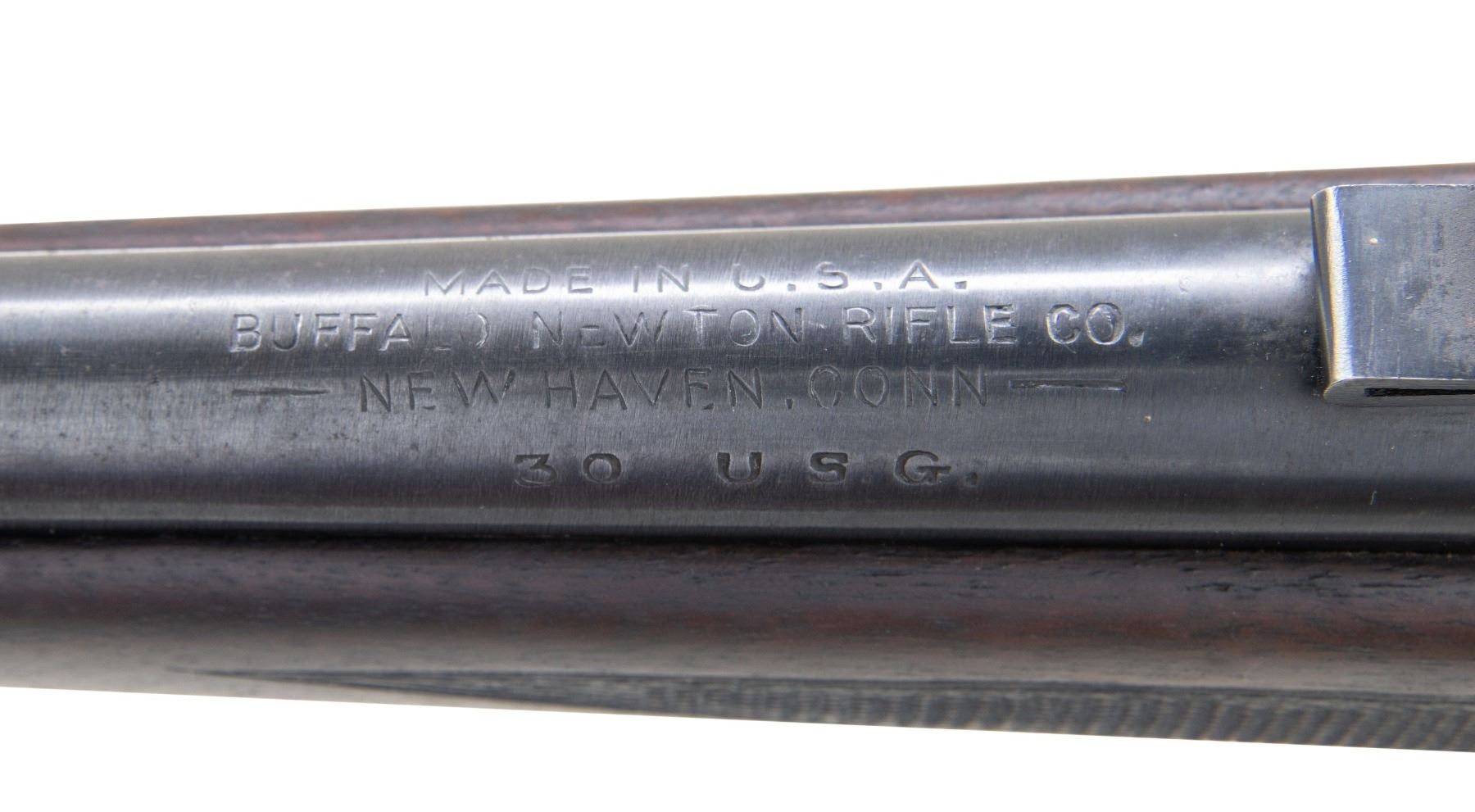 RIFLE. Cal. 30 U.S.G. (30-06.). S# 527 (on bottom of action). Matching numbers on bolt, extractor & 24" bbl. Pinned blade front sight & folding leaf rear sight. Barrel markings include: "PARKERIZED / RUSTLESS FINISH", 'PATENT'S PENDING" & "MADE IN U.S.A. / BUFFALO NEWTON RIFLE CO. / NEW HAVEN CONN / 30 U.S.G.". Mauser style action w/ stripper clip guide, patent magazine spring system & the mag. floorplate utilized for takedown. Dog leg bolt handle. Double set triggers; front is set & will not fire until front trigger is cocked. Checkered walnut schnabel tipped stock w/ steel grip cap, recoil lug & curved steel buttplate. CONDITION: over 80% original blue showing wear to mag. floorplate, bolt handle & trigger guard along with scattered handling marks. Very good wood finish with varnish bubbles throughout, light marks around mag. floorplate, mildew spots & scattered deep marks. Buttplate shows areas of pitting. Good bore shows deep rifling. PROVENANCE: Estate of Russell Dickerman. (25-1880/MD). CURIO. $700-1,000.