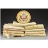 1) 12 BUGLES, BILLY CLUBS & POUCHES. This varied lot includes 12 brass bugles from the post Civil War period. Most bugles appear to be American. Size ranges from 9" to 22". / 8 Billy clubs ranging in size from 9" to 26". / 2 Russet leather equipment boxes w/ “US” in oval embossed on the front. 1 Oval has been defaced. 1 Box marked, “R.I.A.”. CONDITION: most bugles have some dents. Equipment boxes show period alterations. Billy clubs show light to moderate wear. (02-14414/BF). 2) 9 CIVIL WAR ERA BLANKETS. A group of 9 Civil War era civilian wool blankets of various sizes. Most blankets are of undyed wool, some w/ colored edging. 2 Blankets appear to have soldiers stencils on them that are of questionable origin. Nevertheless, all 9 blankets date to the Civil War period or before. CONDITION: all blankets are in serviceable condition. (02-14431(9)/BF). 3) CIVIL WAR & OTHER RELATED ITEMS. This varied lot includes 1 sixth plate tintype of a waist up view of a corporal wearing a state issue shell jacket. / 1 Pair of artillery enlisted crossed cannons hat insignia that appears excavated. / 1 Early 1750s button found in a wreck of an English merchant ship in 1948. / 1 Civil War cap box. / 1 Post Civil War tin cup. / 1 Fairly good reproduction of a North Carolina 2 piece belt plate. / 1 Framed needlepoint American Great Seal. Frame has some damage. / 1 Lg. artillery powder bag. / 1 Heavy ceramic mortar & pestle w/ an extra pestle. CONDITION: items generally show light to moderate wear. Cap box shows heavy wear. (02-14462/BF). $900-1,400.