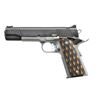 Cal. 9X23 Win. S# BAU-2084. Bbl. 5". Black & silver two tone 1911 mfg. in Israel. Serrated slide front & rear. Checkered front & rear grip straps. Extended beavertail grip safety. Fiber optic front sight w/ drift adjustable rear notch. Checkered slide release. Full length guide rod. Lightweight skeletonized hammer. Attractive two tone walnut Herretts Special Checker pattern grips. Mag:1 steel factory mag. UNATTACHED ACCESSORIES: plastic carry case. Two tone gray & black G-10 grips. Original plastic shipping case w/ cleaning kit & paperwork. CONDITION: finish on all exterior surfaces complete & consistent. No apparent blemishing except for extremely gentle thinning on some high spots. Grips also unblemished. Shiny bore w/ appropriate rifling. Fire control mechanism appears to function correctly when cycled by hand. (22-1803/JZ) MODERN. $900-1,400.