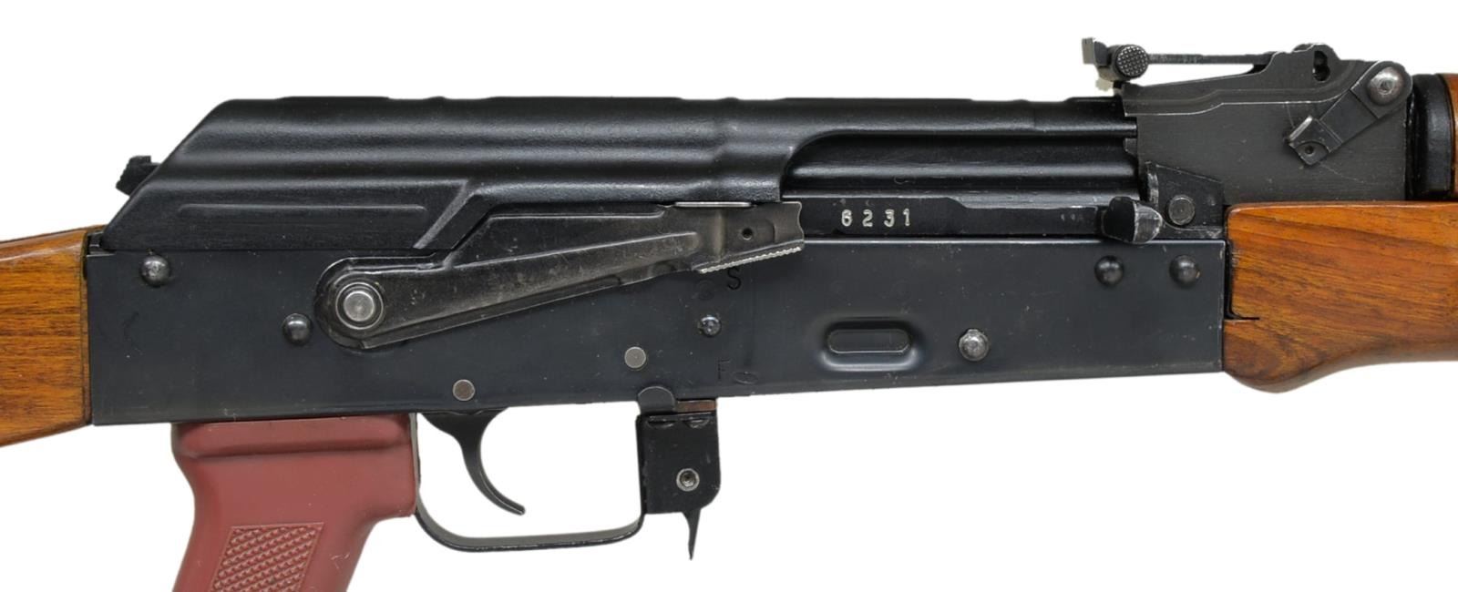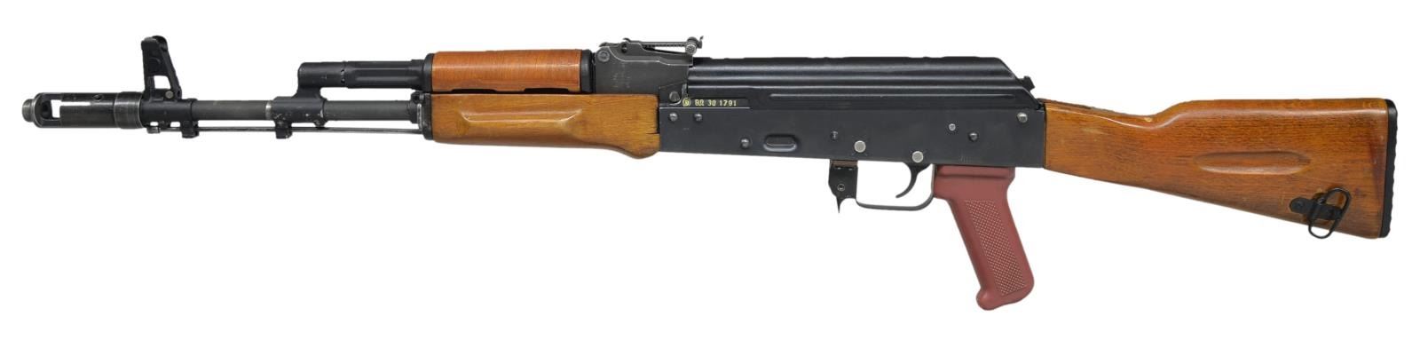 Cal. 5.45x39. S# R001934. Bbl. 16". A NODAK Spud stamped receiver is the element that brings what appears to be an original Bulgarian AK-74 back to live another day. From the correct oversized muzzle brake, to the properly inlet shoulder stock, even including the reddish-brown checkered plastic pistol grip, everything other than the receiver screams “ComBloc”! Chambered in the fabled 5.45x39 rd. thought by many to be far superior to the more common loadings. Satin black receiver w/ dark matte black top cover. Tapco trigger. Right hand muzzle threads for larger 24mm accessories. On board cleaning rod captive through the dual bayonet lugs. Left side sling swivels front & rear. Metal buttplate w/ spring loaded compartment trapdoor. CONDITION: obviously a ComBloc parts kit assembled on a US receiver, so the finish may not match all parts as would be expected. There are some marks earned during either disassembly of the original gun or reassembly of this gun of the gas block coinciding w/ cross pins. Stocks have arsenal typical dents & impression, but nothing that appears to influence structural integrity. It appears the spring is broken on the mag. release, as it is currently free floating. Bore is shiny w/ good rifling. Fire control mechanism appears to function correctly when cycled by hand. (21-700/JZ). MODERN. $400-600.