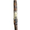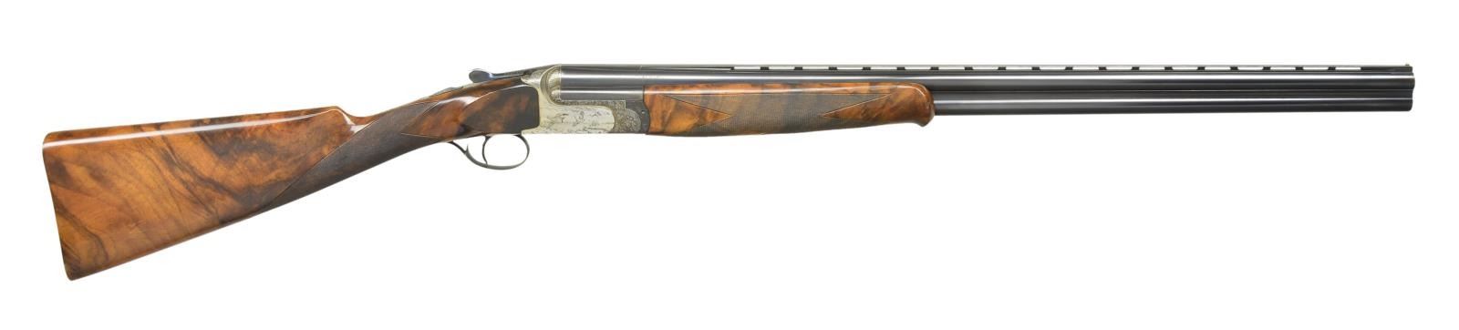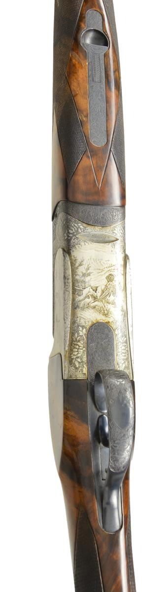 GAME GUN. Cal. 20 Ga. 2 3/4". S# 10052. (CA 1980). A new gun of this grade retails at over $35,000. This gun has 27 1/2" mono bloc barrels with narrow matted ventilated rib. Top left of mono bloc has Perazzi info. Bottom of mono bloc is stamped with 1980 Italian nitro proofs. Coin finished low profile O/U action features non automatic safety and single non selective trigger. Action is very finely engraved with nearly full coverage, well cut floral accents in a sea of small scroll which surrounds attractive Bulino game scenes. A trio of chucker partridge are on left flying away; rear member of the group has feathers flying as it has be hit by shot. Right side depicts the same scene, birds incoming, viewed so that rear bird is hit. Its head is thrown back and it is about to fall from the sky. Bottom of action shows a very fine rendering of a pointer retreiving cock pheasant. Blued top lever, trigger plate and trigger guard are engraved with flowers and scroll. Attractively marbled and figured European walnut, straight grip buttstock measures 14 1/4" over checkered wood butt. Very closely spaced point pattern checkering is at grip. Matching one piece schabel forend has Deeley type release. MEASUREMENTS: BBLS: Bore Diameter: U .625". O .625". Restriction: U .014" (Mod). O .027". (Full). Wall thickness: U .034". O .038". STOCK: DAH: 2 1/8". DAC: 1 5/16". CAST: neutral. LOP: 14 1/4" WEIGHT: 6 lb. 3 oz. CONDITION: very good to fine showing some storage issues. Metal parts retaining over 90% original factory finishes, with some areas of rusting and darkening. Action should be stripped, cleaned, repolished and revarnished. There is no galling evident on knuckle. Stocks have a good scattering of marks, some heavy on left side panel of buttstock. Checkering shows light wear. Bores are bright and shiny, mechanically fine. (22-5860/MGM). MODERN. $10,000-17,000.